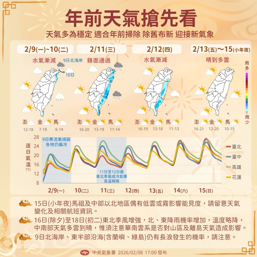 至於春節的天氣,氣象署初步說明,2/16(除夕)至2/18(初二) 東北季風增強及影響,北臺灣氣溫稍下降,北東地區雲多、降雨機率增加,其他地區多雲到晴。