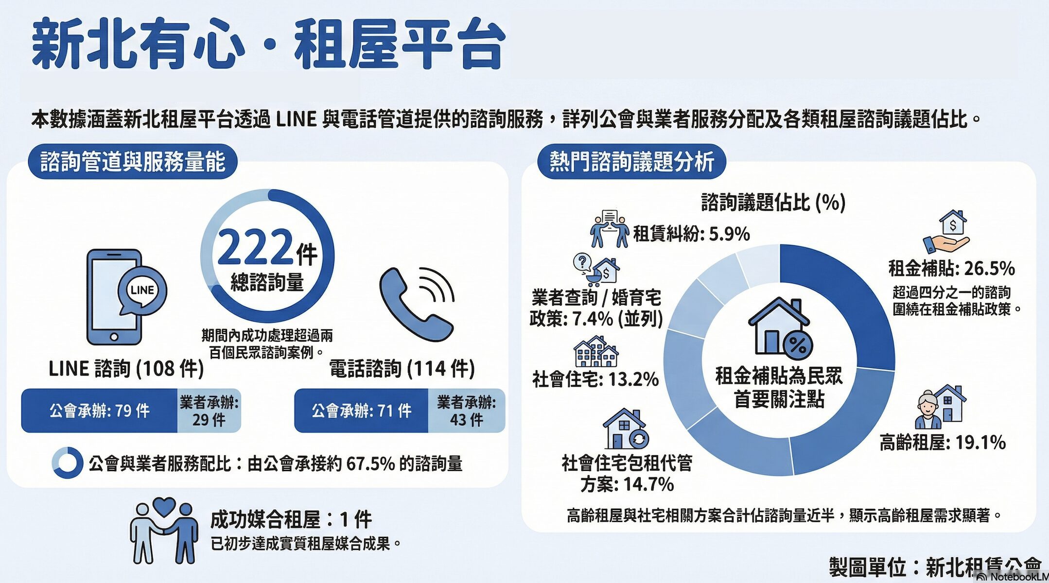 新北市地政局地價科科長蕭湘君表示,過去民眾遇租屋問題,常因資訊分散、求助無門而困擾,對此,「有心.租屋平台」整合了新北市租賃公會與友好業者的資源,提供不受時空限制的線上諮詢服務。統計顯示,上線以來已受理的222件諮詢中,由公會直接處理的案件150件,其餘72件由友好業者協助處理,並有實際媒合成功之案例。透過專業人員的即時引導,大幅縮短民眾查找租屋資訊的時間。
