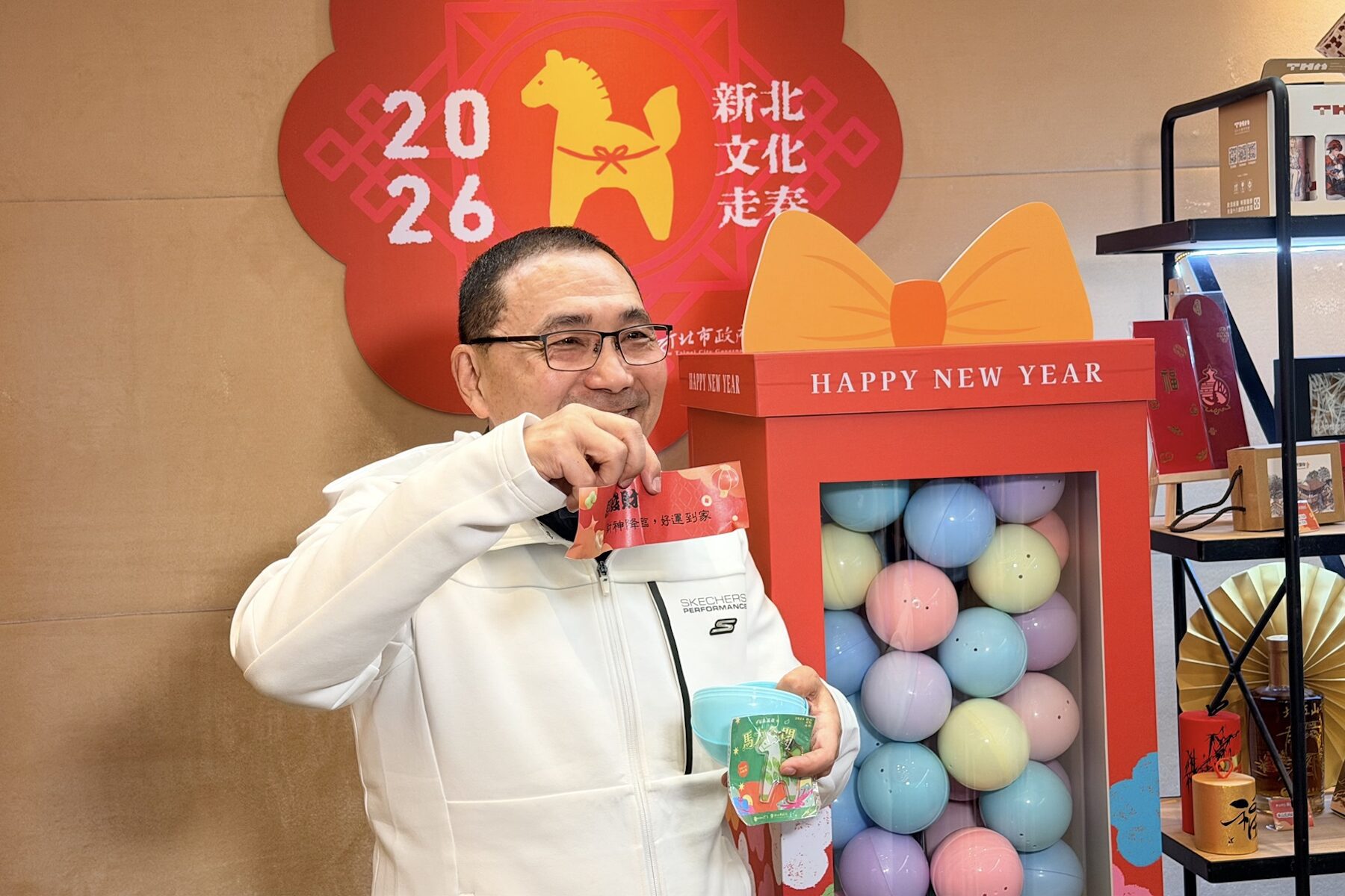 緊接著2月18日(初二)至2月22日(初六),文化走春正式登場,邀請民眾走進「六館一園」參加「轉好運扭蛋活動」,憑當日消費滿500元發票,即可轉一次扭蛋,獎項包含馬年吊飾、馬年限定印章及小怪獸公仔等好禮,每日每館限量100個;此外,民眾也可與「馬力全開禮物盒」合影,並於文化局官方粉絲專頁指定貼文上傳照片並留言,即可兌換限量馬年貼紙一張 (數量有限,換完為止),同時還有機會抽中價值千元的「美學廊帶福袋大禮包」,將專屬新北的博物館紀念商品帶回家。
