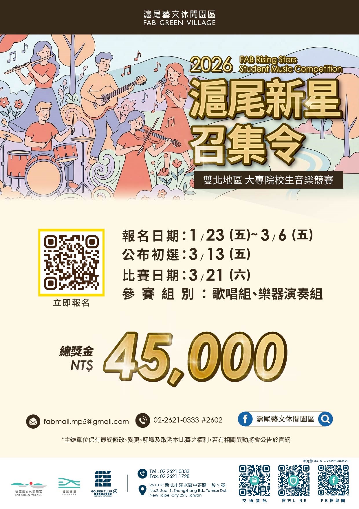 第六屆「滬尾新星召集令」報名截止日至3/6!比賽分為歌唱組與樂器演奏組,無論是擁有動人嗓音的歌者,或是精通樂器的演奏者,都歡迎勇敢挑戰,一起競逐總獎金高達 45,000 元的豐厚獎勵!本屆邀請到重量級評審,包含金曲作詞、作曲人蔡伯南老師、鄭中庸老師、樓南蔚老師,還有眾多知名歌手的歌唱指導陳威宇老師,以及吉他詩人董運昌老師,將為參賽者帶來專業且具指導性的評選。歡迎才華洋溢的淡水學子踴躍報名,詳細資訊請於「滬尾藝文休閒園區」官網查詢。