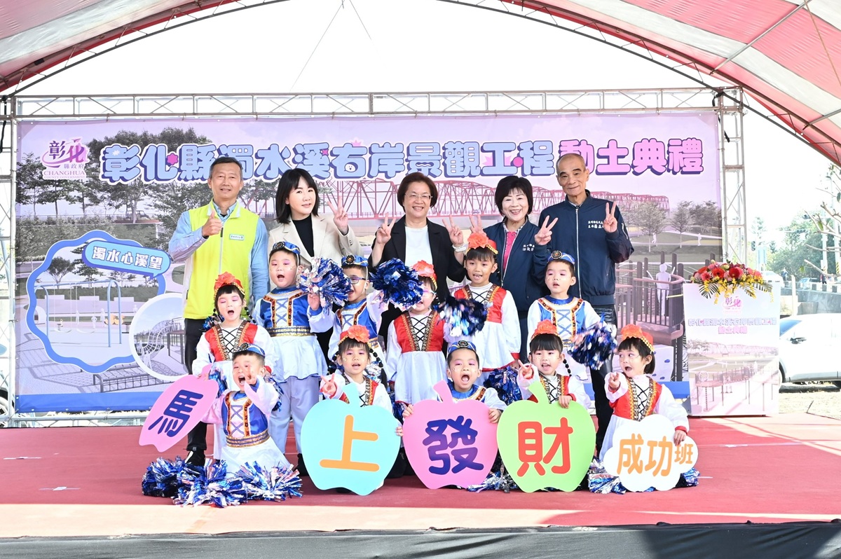 彰化縣政府在濁水溪右岸景觀改善工程將以西螺大橋為主軸,縣長王惠美今(12)日至溪州鄉主持開工動土典禮。特色景觀建置計畫,結合歷史、軍事及水文元素,串聯五分車與鐵軌意象,並設置滑步車場、多項兒童遊憩設施,打造水岸特色新風光。全案工程總面積約3.6公頃,總經費4,354萬5,000元,工期預計240日曆天。