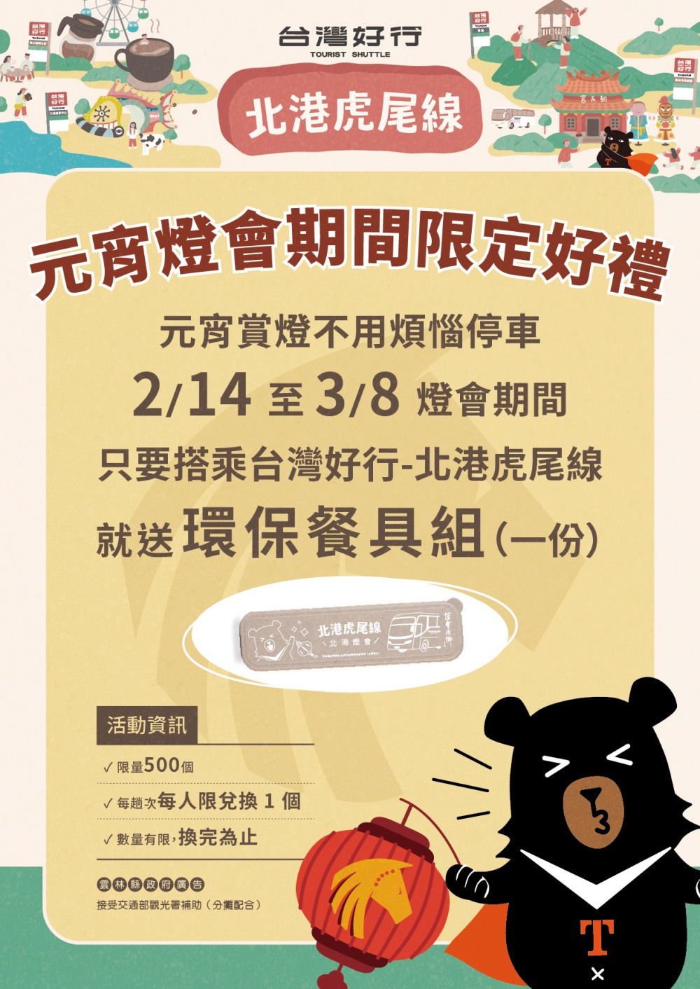 ▲北港燈會期間搭乘台灣好行-北港虎尾線就送限量環保餐具組! (圖/雲林縣政府文化觀光處提供)