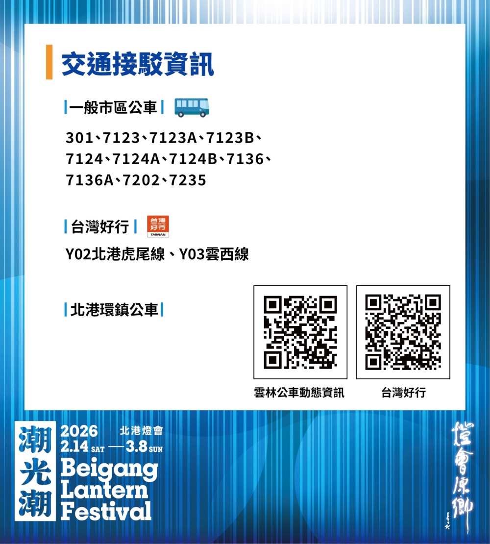 雲林縣政府進一步指出,燈會期間適逢春節過後旅遊旺季,建議民眾提早規劃行程,善用台灣好行觀光路線,不僅交通便利,更可同步參與限量好禮活動。無論是闔家出遊、朋友相約或情侶約會,搭乘北港虎尾線賞燈,都能讓旅程更輕鬆、安心又環保。除一般市區公車及台灣好行路線,更有北港環鎮公車,自2月14日開始,每天自北港第一停車場、北港1911好庫文化產業園區等停車場域接駁至鎮內各景點,配合燈會期間,平日加開夜間服務,假日則延長至晚間9點。