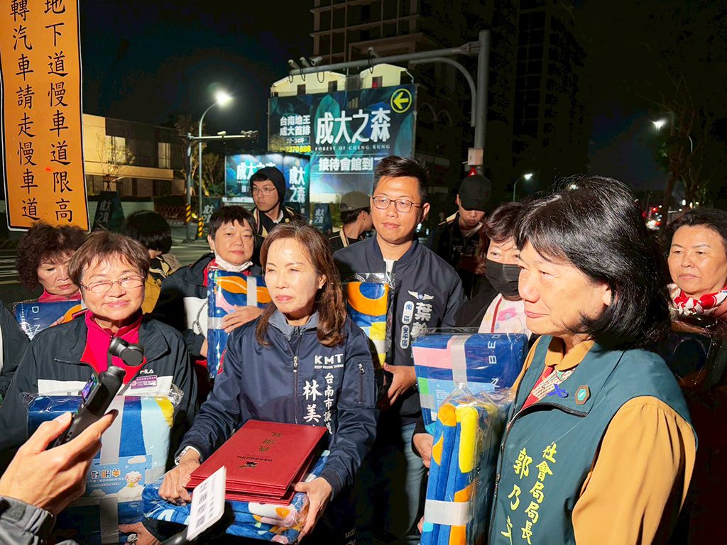 【記者吳玉惠/臺南報導】 寒流接連來襲,臺南市議員林美燕與接班人葉翰勳偕同善心團體和店家,於2月 12日晚間集體深入街友休憩最密集的北門路地下道,當面贈送募得的過年禦寒物資,讓街友們感動頻頻微笑道謝。