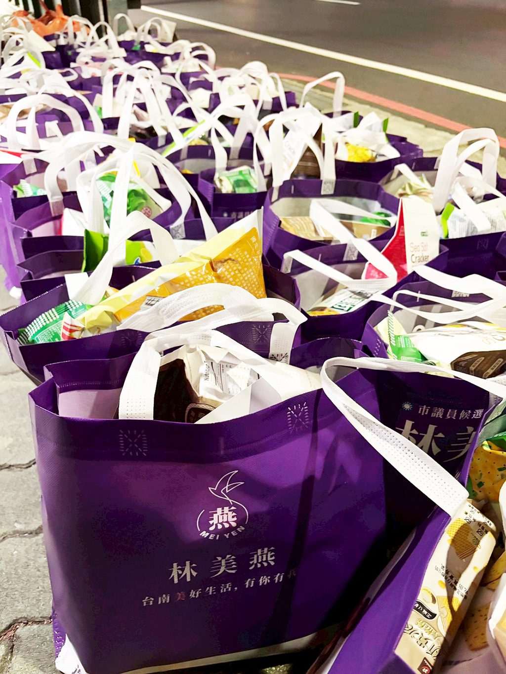 本次愛心送暖行動,聚集物資多達60份,包含億進寢具的菱炭環保機能襪、好眠羊毛毯,還有乾糧、餅乾、泡麵、八寶粥、罐頭、飲料以及熱騰騰的杏仁茶,捐贈的阿卿杏仁茶、台南市婦女聯合會、康黃金慈善愛心協會安平分會、億進寢具企業有限公司等單位出錢又出力,加上社會局工作人員,參與愛心送暖行動將近50人,將地下道擠得水洩不通,也暫時擋住了寒風,使得當地空曠的空間瞬間溫暖起來,全程僅花20分鐘就圓滿結束。