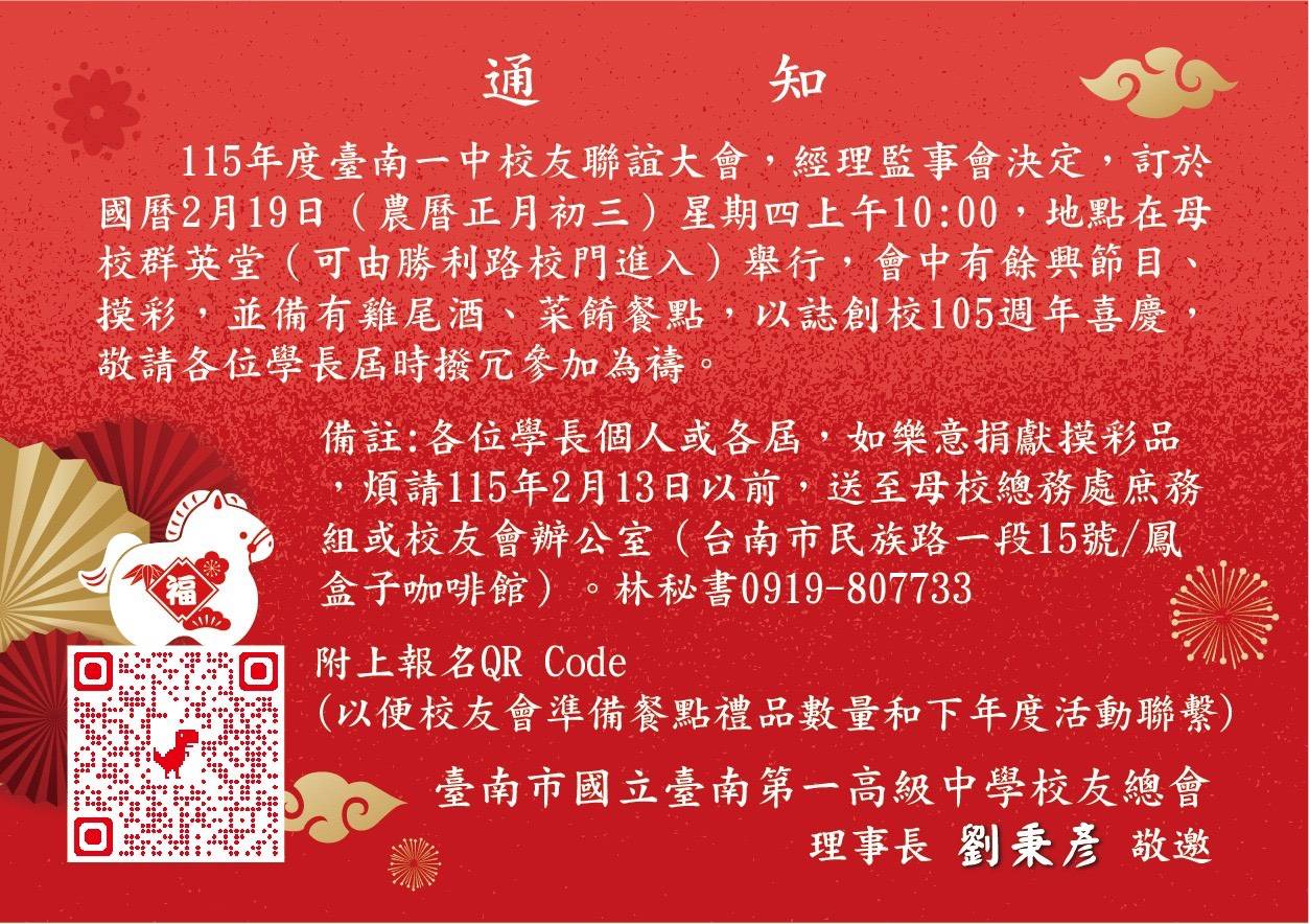 校友總會表示,新春團拜不僅是溫馨相聚的時刻,更象徵世代傳承與責任接棒。南一中一路走來,仰賴無數校友在各領域的卓越表現與無私支持,誠摯邀請歷屆校友返校參與,共同見證母校新階段的教育願景,攜手開創下一個十年榮光。