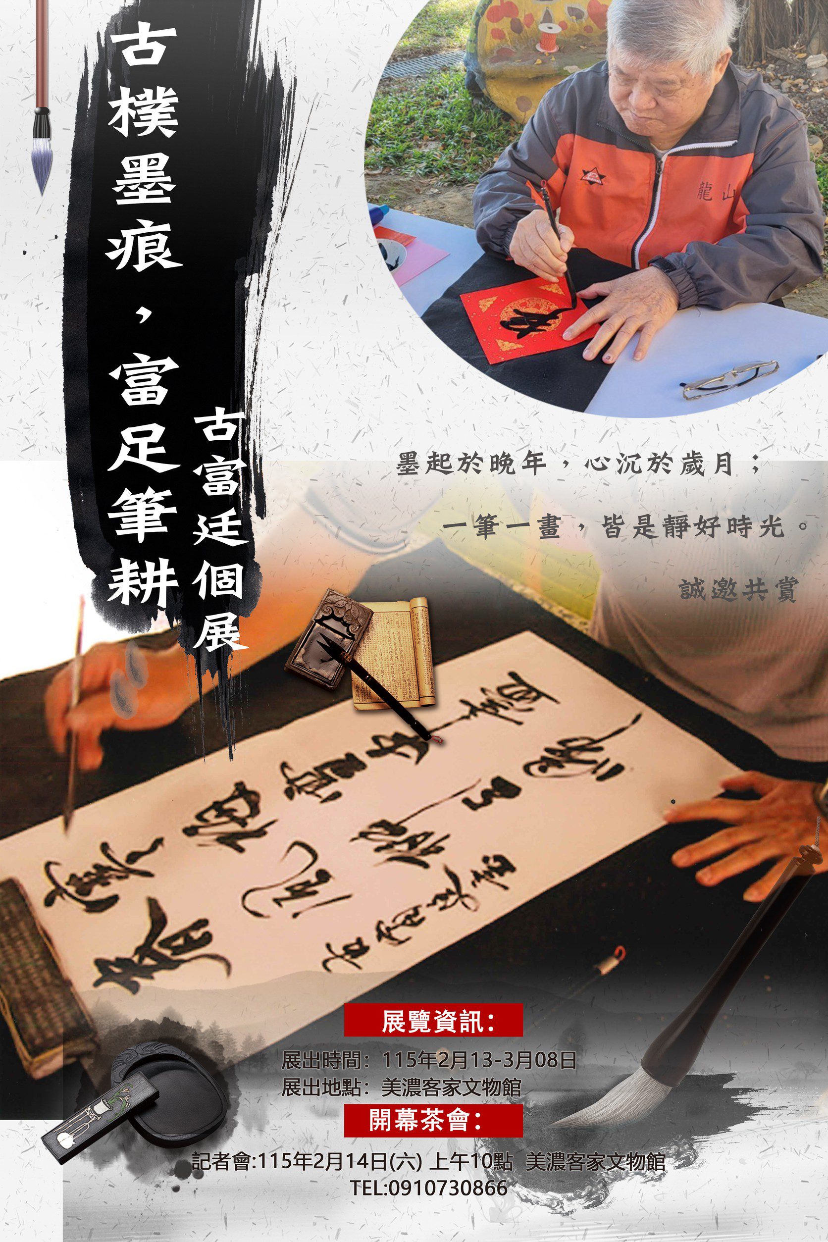 時逢年節,天朗氣清,惠風和暢,誠摯邀請各界舊雨新知踴躍前來美濃走春,並一睹古富廷主任「古樸墨痕.富足筆耕」的書法藝術之美。