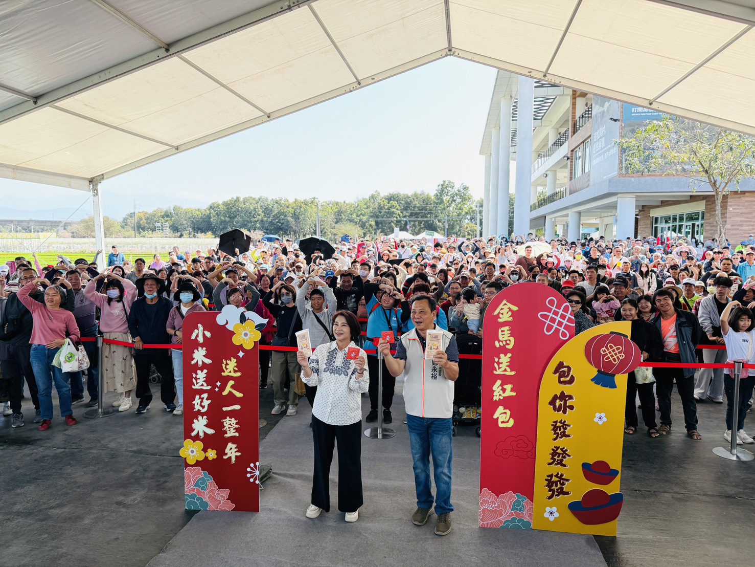 周春米表示,今年設計兩款限量一元小紅包,包含「瑞馬春騰」與「轉轉馬戲團」,結合馬戲團造型與轉盤概念,象徵轉動好運、福氣連連;轉動時更能看見屏東多元農產意象,傳遞農業豐饒祝福。此外,今年加碼發送平安米,米源來自園區彩繪稻田採收稻米並以真空包裝製成,將農業成果分享給民眾,寓意新年平安順遂。