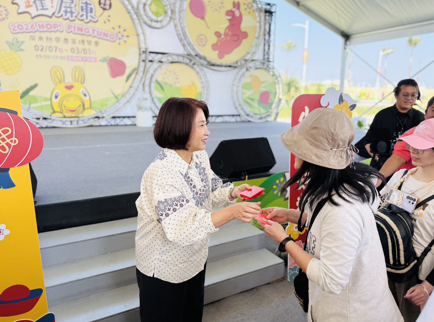 【記者戴英薇/長治報導】 屏東春節人氣活動「2026屏東熱帶農業博覽會」年節期間持續吸引大量人潮,今(20)日大年初四迎財神吉日,周春米前往園區向民眾拜年,發送「轉轉馬戲團」一元小紅包與平安米,與鄉親共享新春喜氣。現場鼓陣震天、醒獅熱舞,財神爺驚喜現身炒熱氣氛,園區洋溢濃厚節慶氛圍。