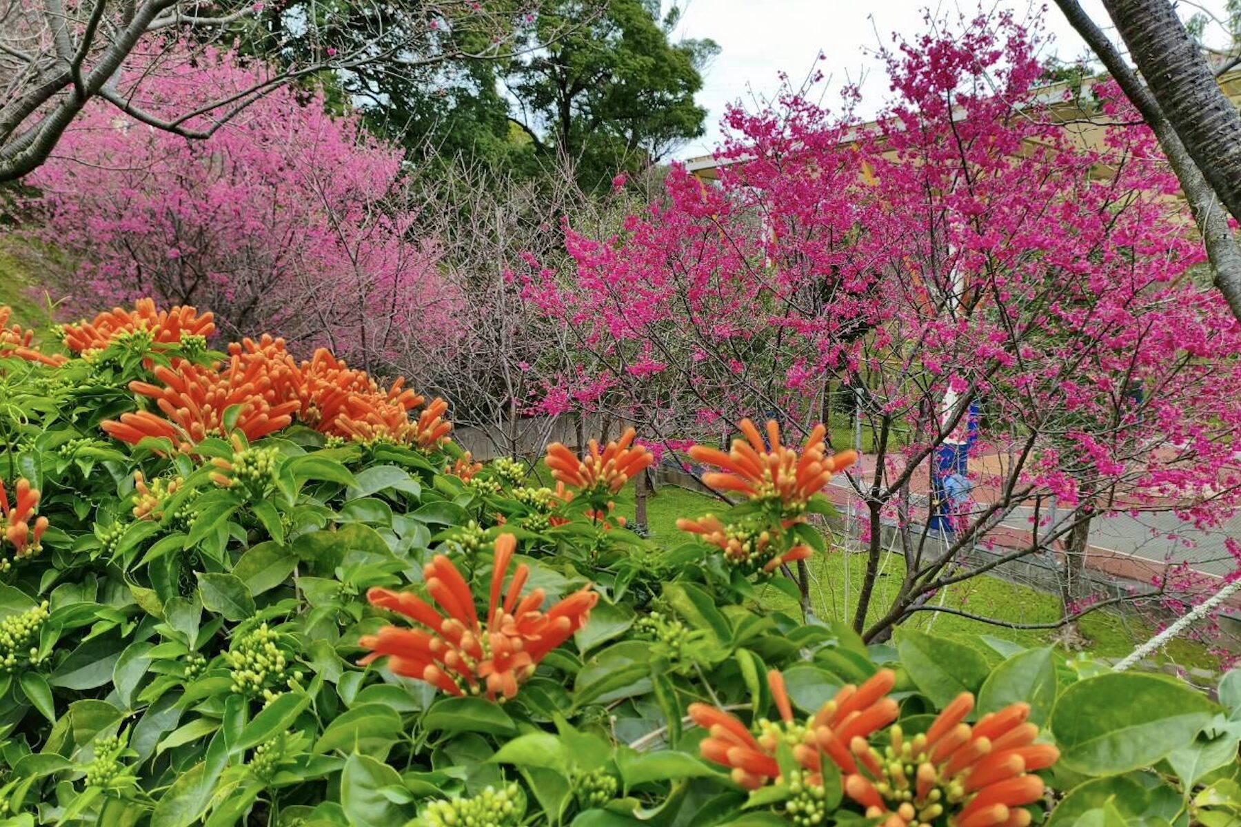 ▲鶯歌永吉公園一年四季均有花可賞,時值春季可以欣賞櫻花與炮仗花逐一盛開的美景。(圖/新北市景觀處 提供)