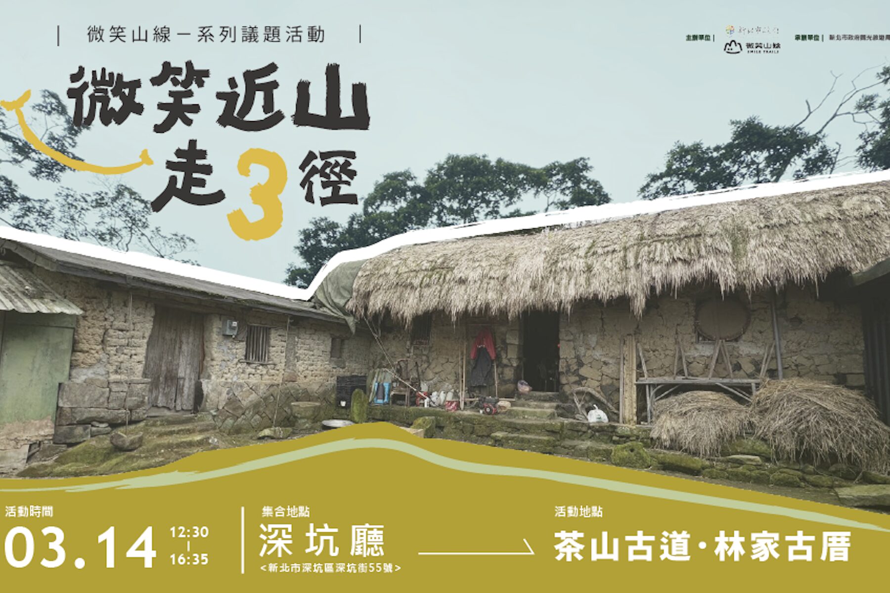 新北市政府觀光旅遊局將於 115 年 3 月 14 日(六)在深坑茶山古道「林家草厝」舉辦「微笑近山走3徑」山林展演主題活動,結合茶文化與音樂展演及山林健走,邀請民眾走入山林、回望茶路,在自然與人文交織的場域中,體驗放慢步調、沉澱身心的近山生活,並探索深坑四寶之一「茶」之文化。