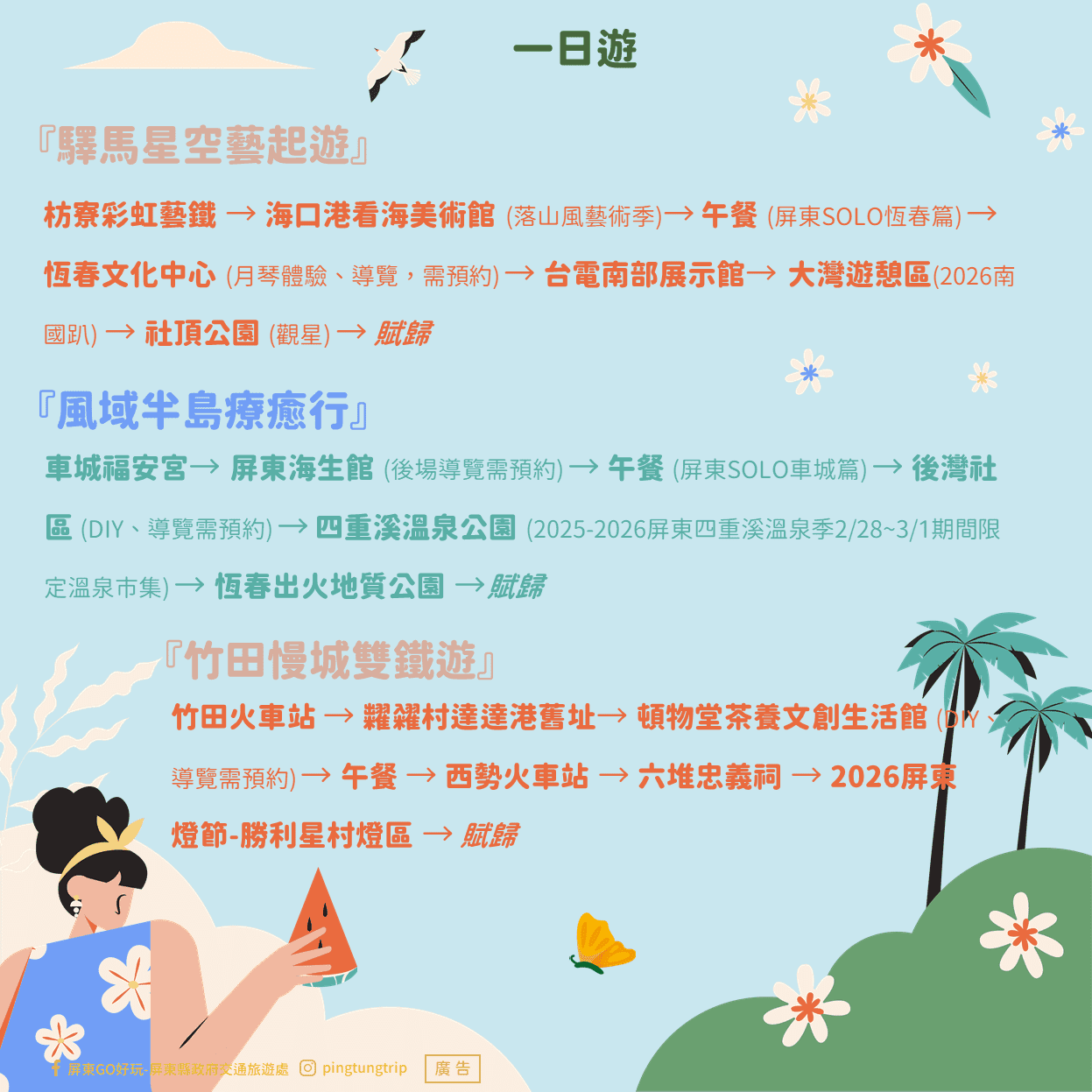 本次特別規劃一系列融合現代、歷史、藝文、生態及地方人文體驗的特色遊程,邀請國內外旅客深入南國,感受屏東多元的文化脈絡與自然風情。交通旅遊處提醒民眾在這個和平紀念的日子,出外旅遊務必選擇合法旅宿,以確保住宿品質與人身安全,切勿入住未合法申請登記及違規擴大營業房間之旅宿業者,為打造屏東友善旅宿品牌,請多方支持「屏東金鑰獎優質旅宿」名單,並歡迎民眾持續關注鎖定屏東旅遊網(https://www.i-pingtung.com/)最新資訊,屏東交通旅遊相關訊息請追蹤「屏東GO 好玩」與「屏東GO 交通」FB、IG 及Threads社群平台,並歡迎下載「屏東GO 好玩」、「屏東ㄟ公車」APP 掌握第一手活動訊息。