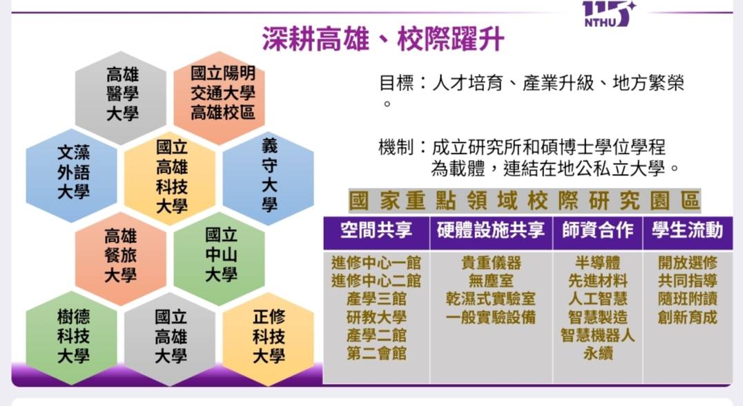 因應「國家南部產業發展」與科技布局政策,高雄逐步形成半導體、智慧製造與淨零轉型產業聚落,並成為「國家重點領域校際研教園區」的重要基地。教育部於113年6月核准清華設立高雄校區,期望透過跨校、跨域、跨產業整合,建構完整研教平台。