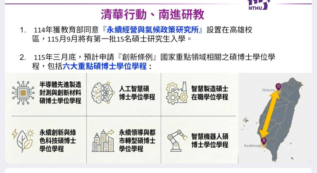 清華副校長嚴大任說明,高雄校區採分階段建設,目前已完成進修一館整建與研究所招生。未來將陸續申設六大國家重點領域碩博士學位學程,包括半導體先進製造封測與創新材料、人工智慧、智慧製造、永續創新與綠色科技、永續領導與都市轉型、智慧機器人等方向。