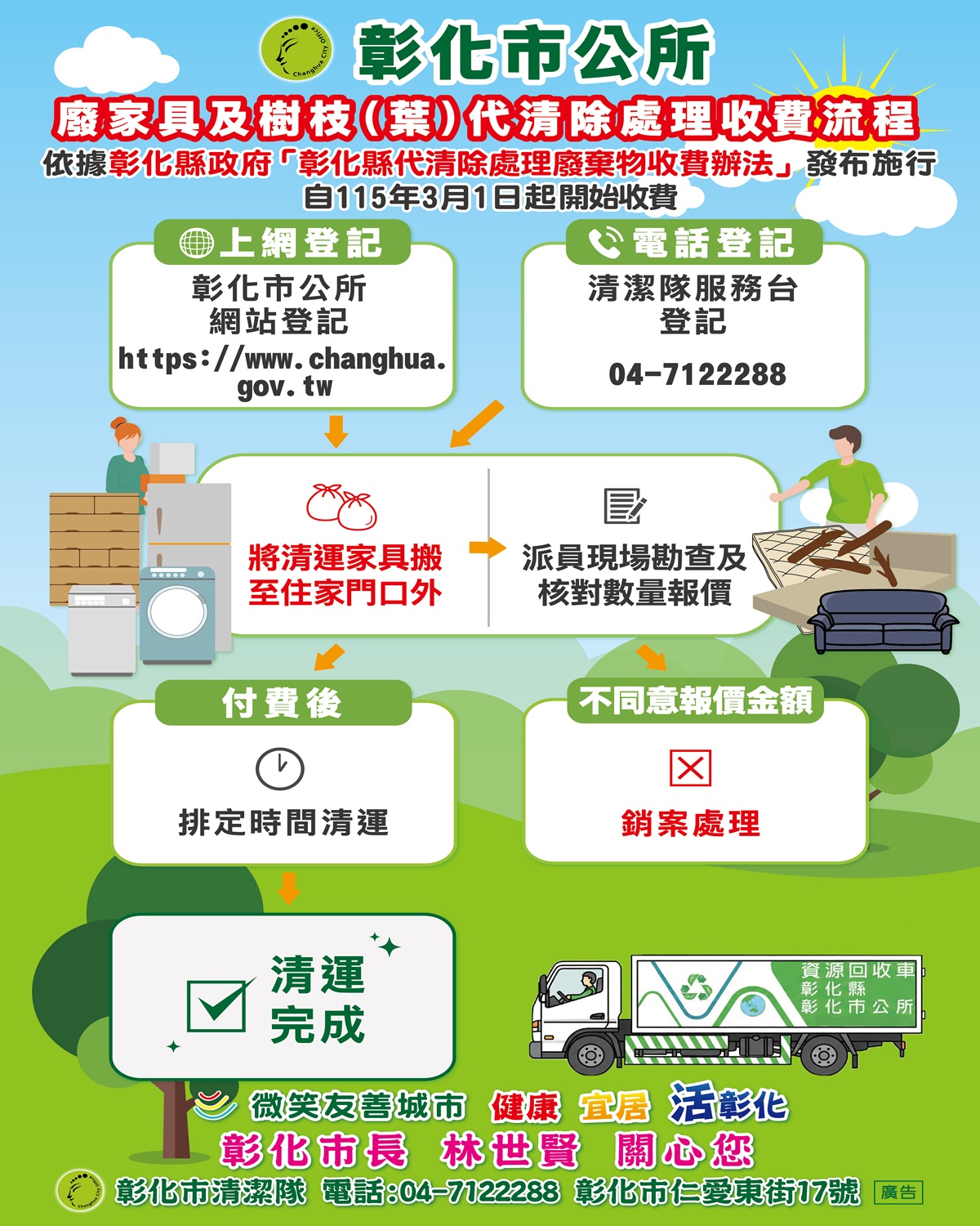 彰化市清潔隊強調,政策變革初期或許會帶來些許不便,但為了城市長遠的環境整潔與清潔同仁的職安,期盼市民朋友能體諒並配合。民眾如需申請大型家具清運,請務必先向清潔隊預約並依規定繳費。讓我們攜手合作,讓彰化市成為更宜居的永續家園。