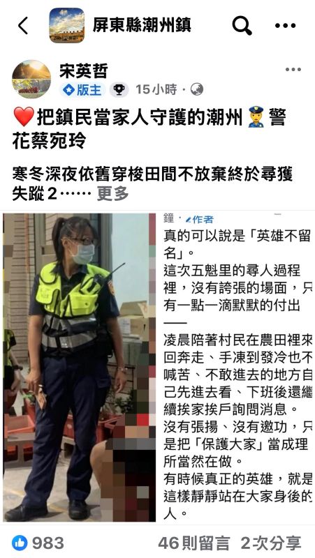 警員蔡宛玲主動積極查尋失蹤人口,即使深夜下班後仍持續挨家挨戶詢問民眾有無老農的消息可提供,潮州鎮民深受感動,於屏東縣潮州鎮社團(臉書)PO文感謝,並至中山路派出所致贈花籃表達謝意。