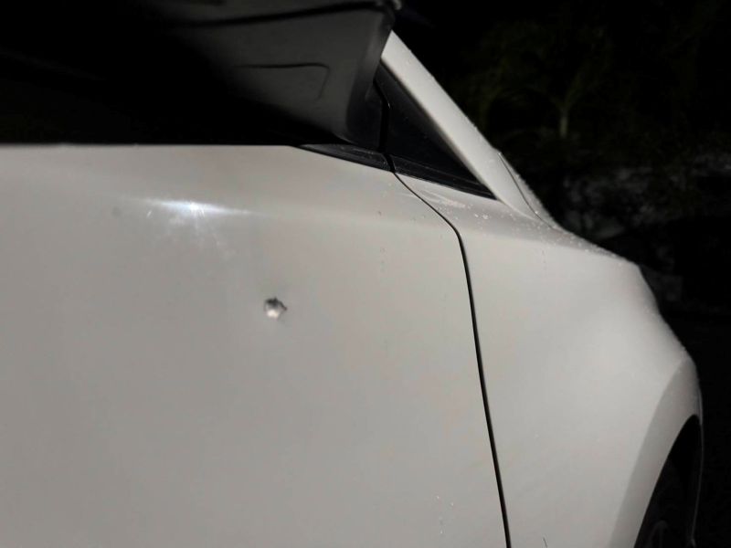 ▼南灣路與新生巷口遭對方駕駛持BB槍往蕭民的車輛射擊,導致右前車門受損。(圖/屏東縣政府警察局恆春分局)