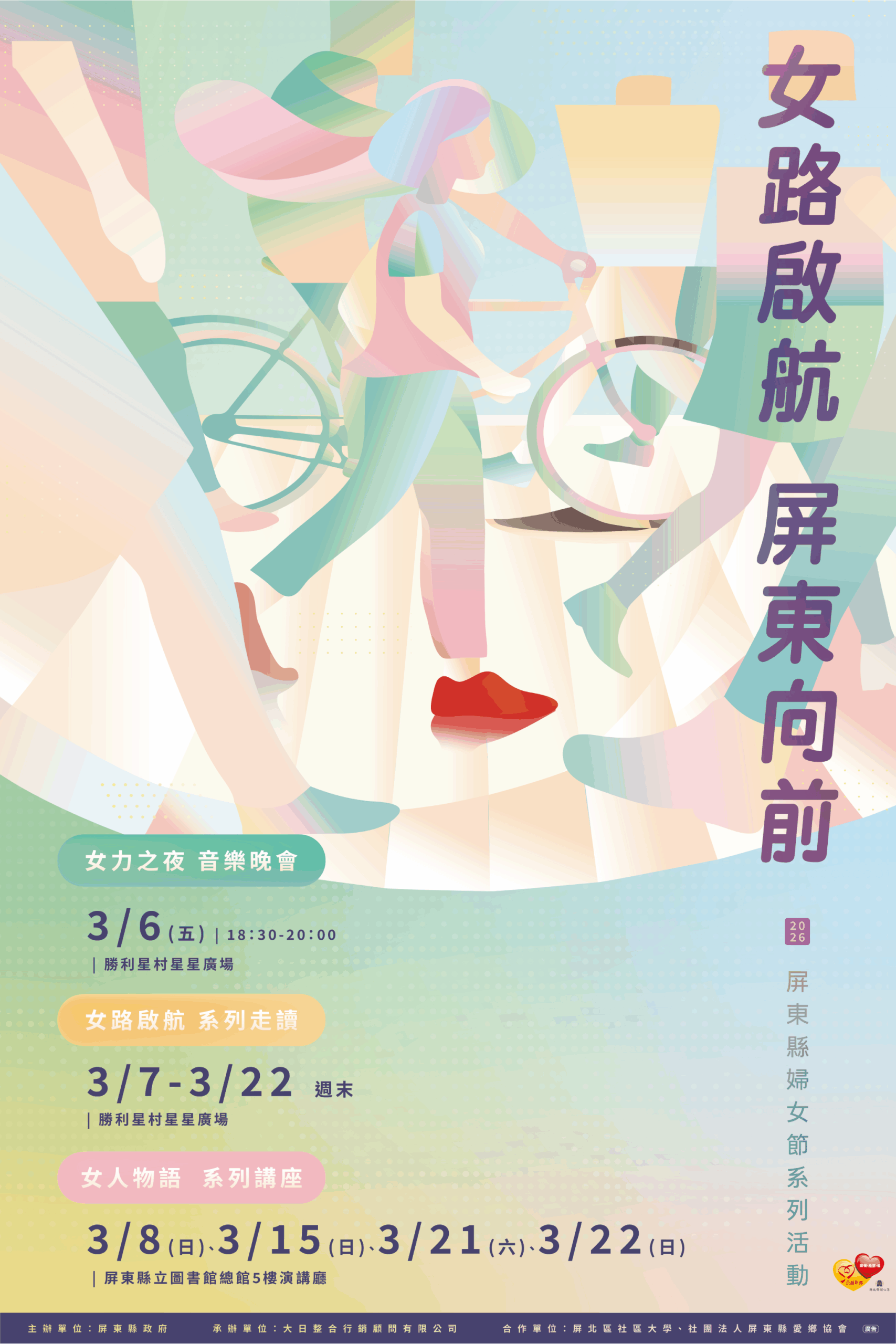 【記者張詠斯/屏東報導】 為迎接國際婦女節,屏東縣政府將於3月6日至3月22日推出婦女節系列活動,包括「女力之夜」、「名人講座」及「屏東女路」走讀導覽,邀請民眾從歷史看見女性在家庭、職場與社會中的多元樣貌及韌性,系列活動陸續展開,多場次報名踴躍、即將額滿。