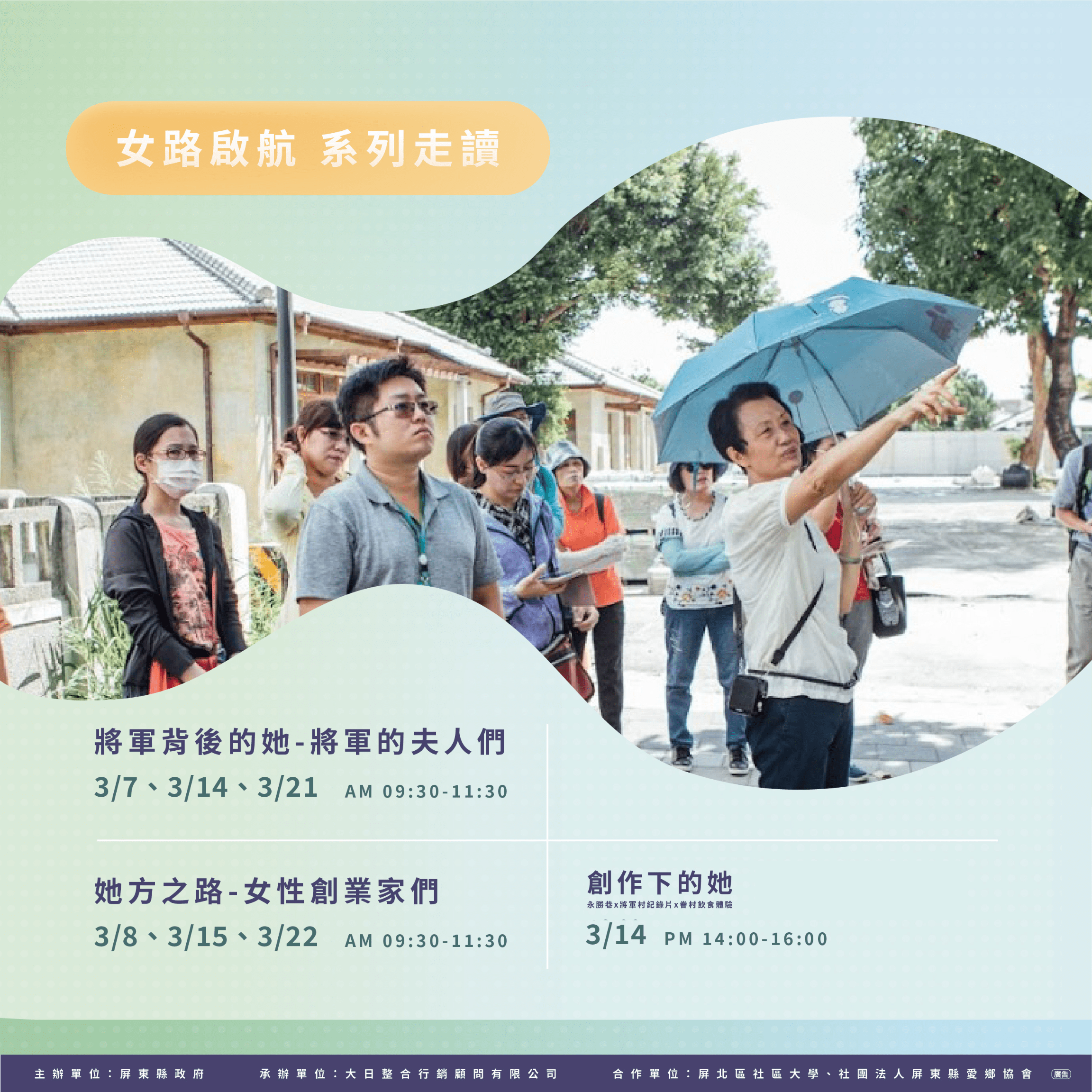 此外,「女路啟航」走讀導覽共辦理7場次,由專業女路導覽員帶領民眾實地走讀,聆聽女性生命故事,主題一「將軍背後的她-將軍的夫人們」於3月7日、14日及21日辦理;主題二「她方之路-女性創業家們」於3月8日、15日及22日舉行;主題三「創作下的她-永勝巷×將軍村紀錄片×眷村飲食體驗」則於3月14日登場。