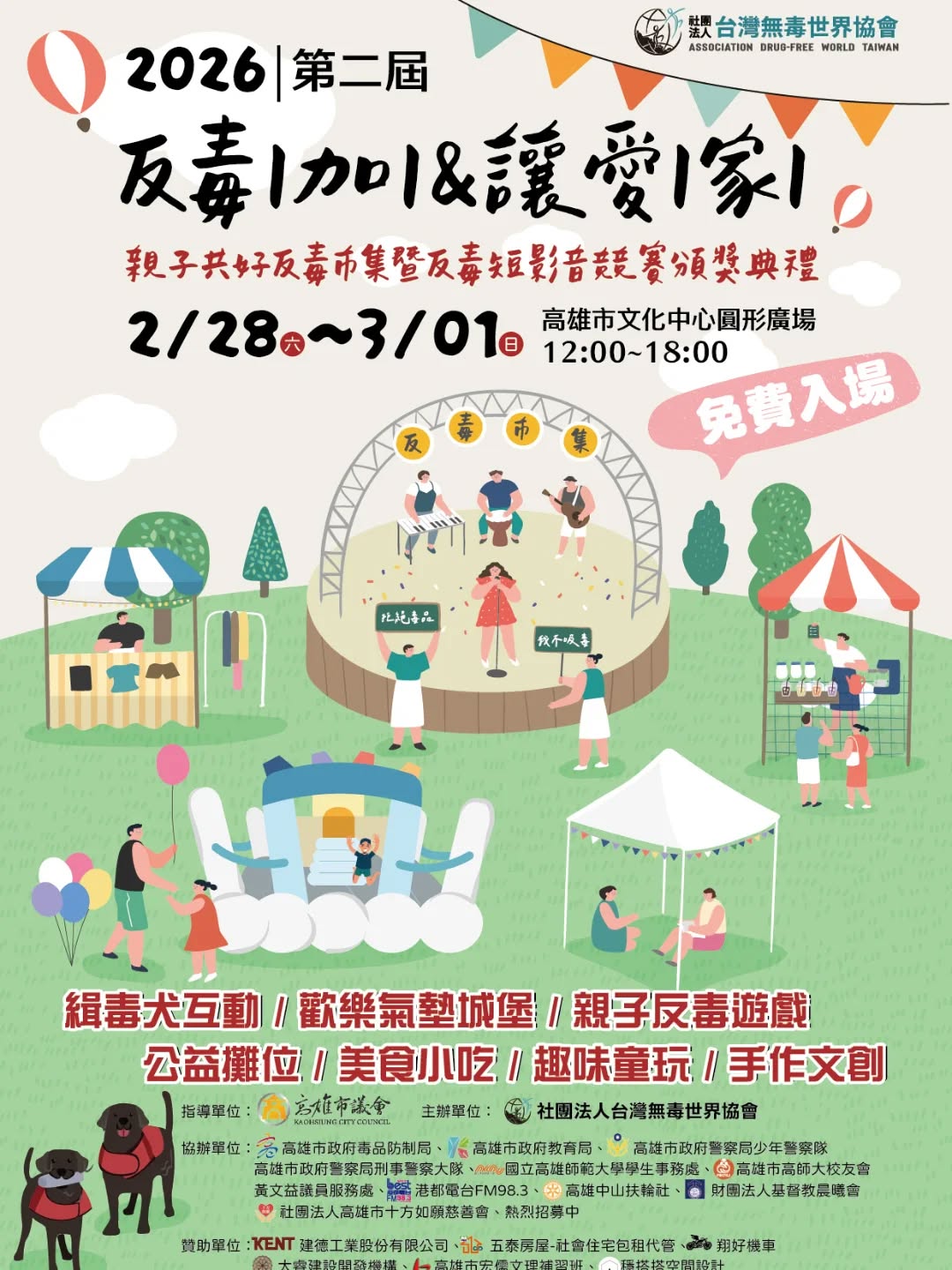 在毒品樣態不斷翻新、誘惑手法層出不窮的今日,家庭成為守護孩子最重要的第一道防線。第二屆「反毒1加1 讓愛1家1」親子共好反毒市集,2月28日至3月1日在高雄市文化中心圓形廣場登場,吸引數千名親子與市民參與。透過宣誓、展演與創意競賽,活動讓反毒教育走入城市日常,凝聚跨世代力量。