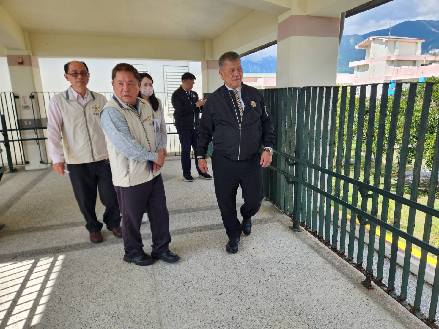 吳志揚聽取「116年工程簡報」後,隨即由游文勇陪同勘察家區,聚焦改善住民生活品質與安全,首先勘察受海風侵蝕嚴重的保健大樓走廊護欄、停車棚及中正紀念堂休憩區,他要求鐵欄杆應定期保養與防鏽粉刷,建議車棚鐵柱底座採水泥包覆工程,以有效延長設施年限;隨後巡視松柏堂及長青堂住民房舍,針對磨損地板更換及衛浴設備修繕提供實質建議,確保工程能精準對接住民需求。
