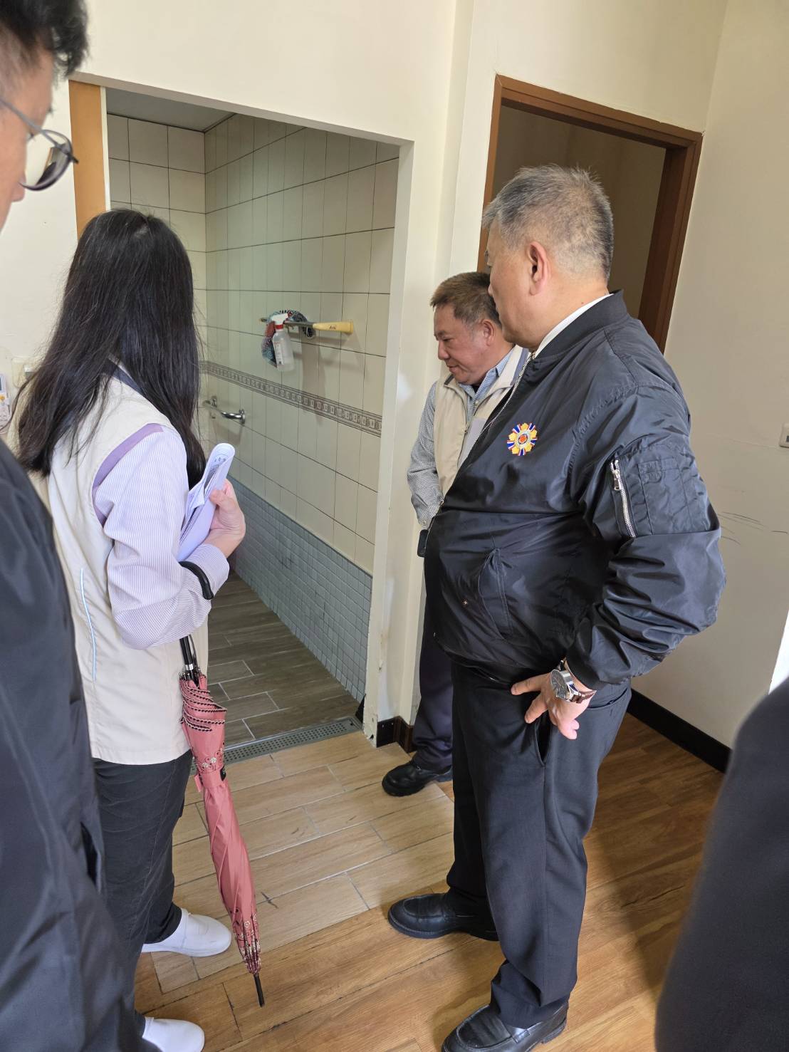 ▲副主委吳志揚(中)巡視安養堂住民房舍,提出浴室地磚等衛浴設備修繕建議。