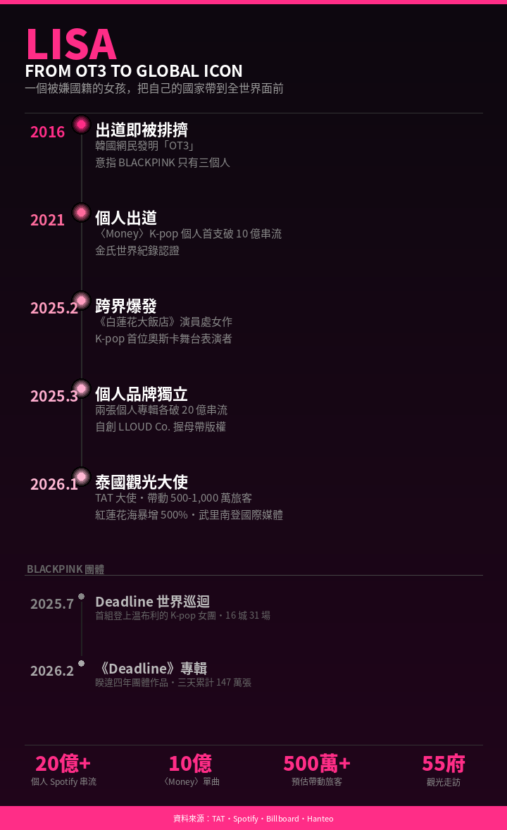 這篇Threads貼文之所以引發共鳴,在於它不是一篇歌迷應援文,而是將「十年前的質疑」與「十年後的成果」並列對照——專輯銷量是團體的,但從被排擠到把自己的國家帶向全世界的故事,是LISA一個人的。