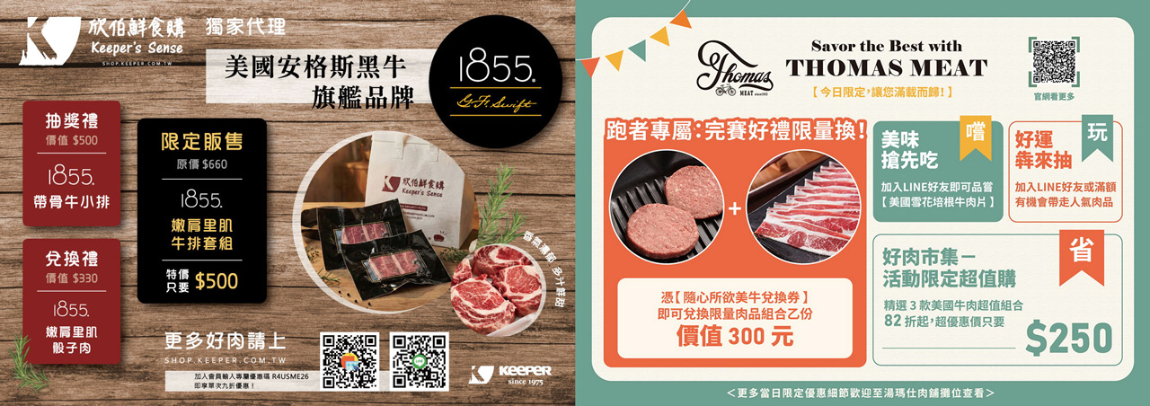 在生鮮肉品類別中,現場提供多款可帶回家料理的兌換選項,包括欣伯鮮食購提供的 1855 Choice 嫩肩里肌骰子肉、湯瑪仕肉舖的 美國牛肉漢堡・燒肉雙享組、Uber Eats優市的美國迷你肩胛牛排三入,以及法蘭克肉品超市推出的 美國嫩肩板腱牛排三包組,讓跑者與民眾將高品質美牛延伸至日常餐桌,自行發揮多元料理方式。