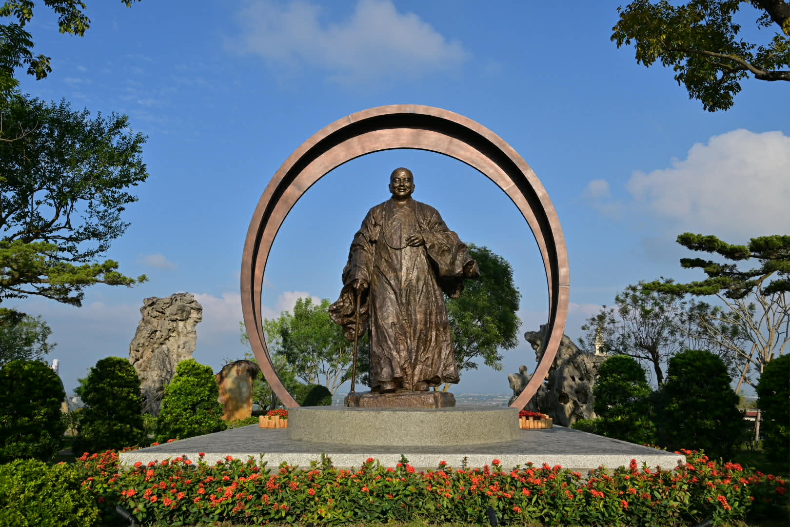銅像周圍環繞高聳挺拔的桃花心木,樹幹筆直,象徵大師一生行誼端正、法性堅定。此處遠眺可見佛光山殿堂群與藏經樓,整體景觀盡收眼底。銅像安座於此,寓意大師之「法」長存道場、與眾同在,未曾遠離。