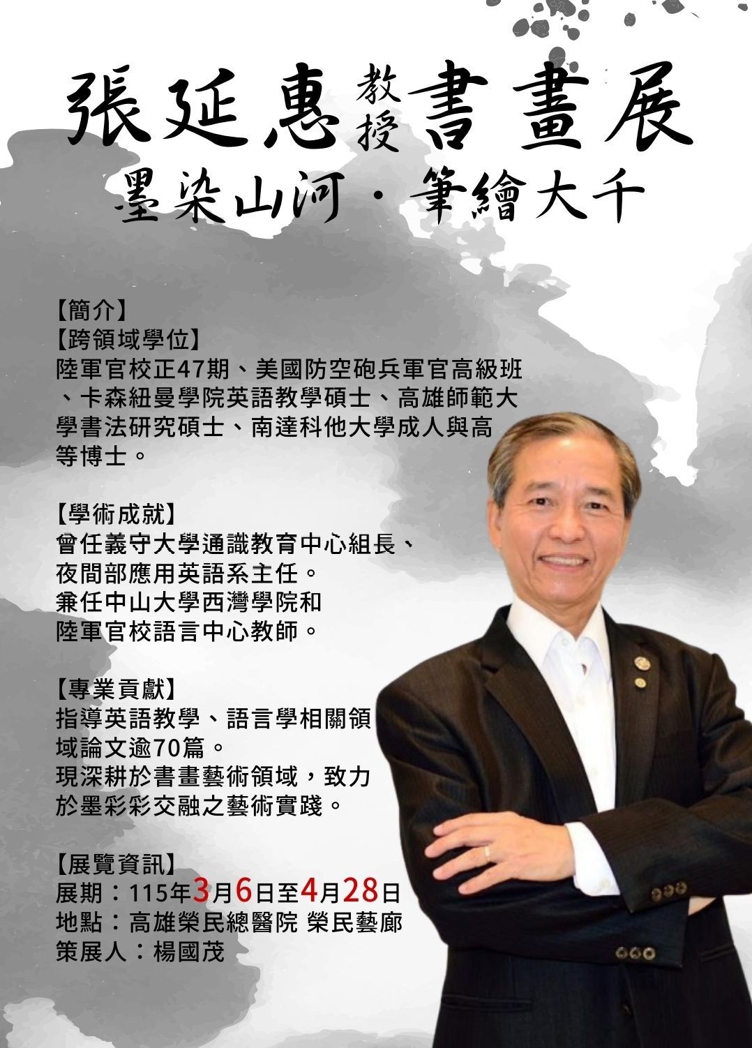 【記者蘇莉湘 / 高雄報導】 一名出身陸軍官校、曾赴美受訓的職業軍官,如何轉身成為指導超過70篇論文的語言學博士,進而沉浸於墨韻交融的藝術世界?這段傳奇般的跨界人生,即將透過筆墨呈現在大眾面前。「張延惠教授書畫展——墨染山河・筆繪大千」將於115年(2026年)3月6日至4月28日,於高雄榮民總醫院「榮民藝廊」正式展出。