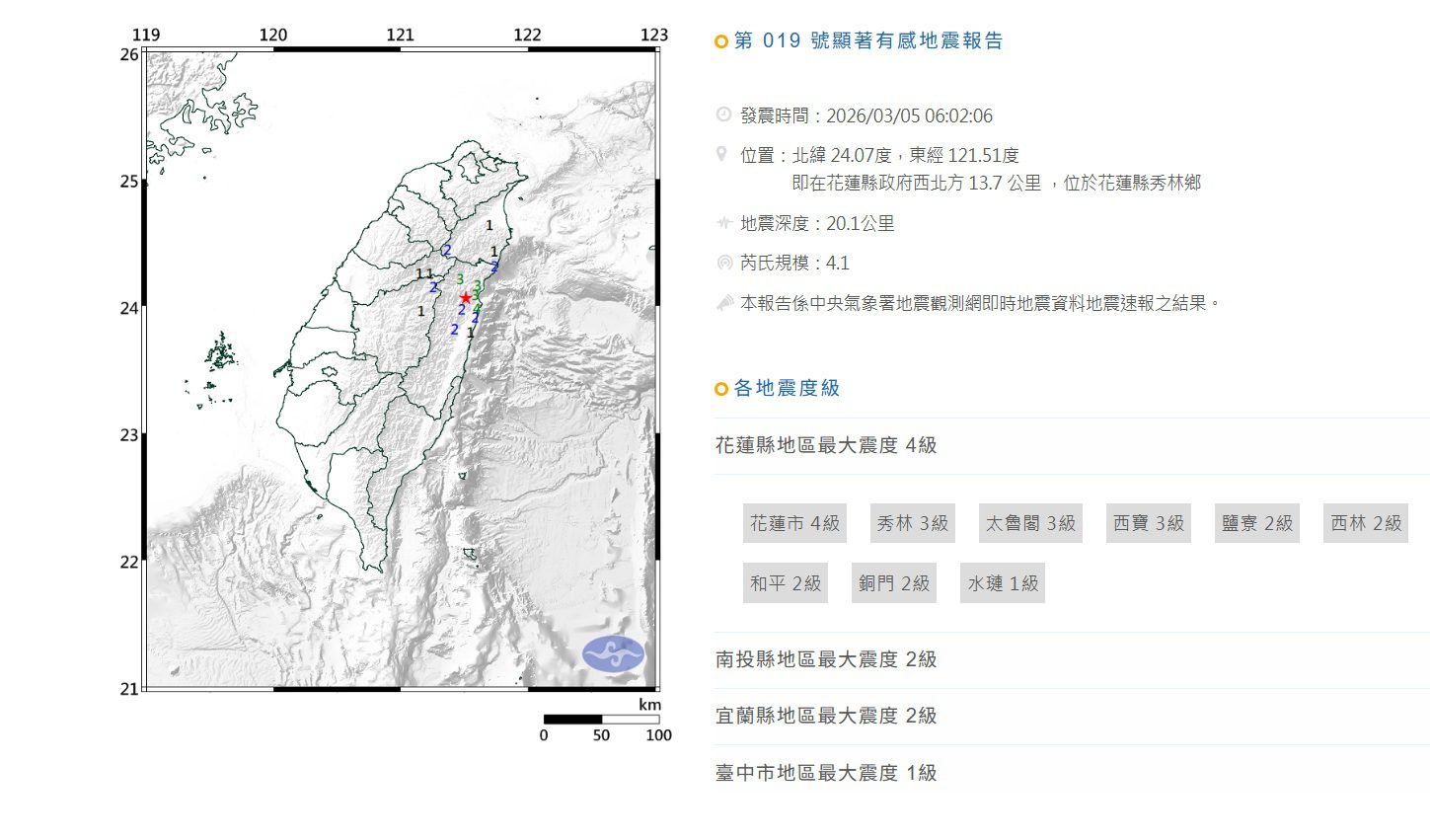 連續71天沒有傳出顯著有感地震的花蓮縣,打破了近三年的紀錄,相當反常。但在第72天的今天上午6點02分,於秀林鄉發生規模4.1的地震,地震深度20.1公里,各地最大震度花蓮市4級,秀林和太魯閣都是3級,終結了這項紀錄。