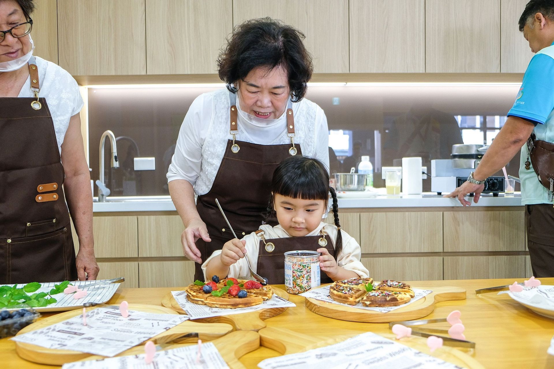 啟動儀式中,邀請貴賓共同掛牌,象徵嶄新空間正式再出發。現場安排空間導覽,由學員親手製作鬆餅邀請貴賓品嚐,讓空間自然轉換為交流與分享的場域。空間內的積木牆則展示著學員們共同完成的創作,牆面隨著參與者加入而持續變化,象徵這是一段「一起完成」的共享記憶,也讓每位走進聚樂部的人,都能在這裡找到自己的位置。