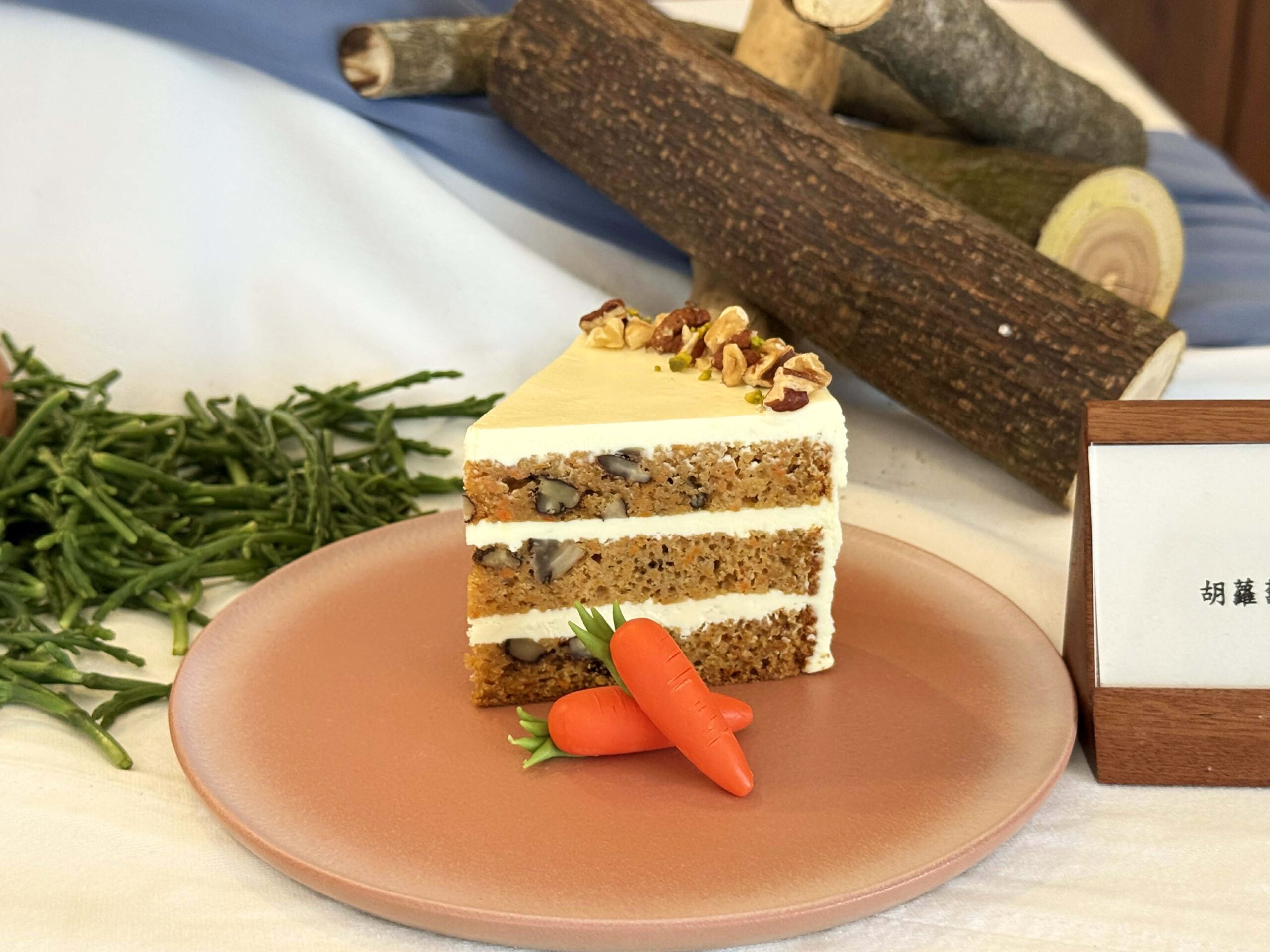 以法式千層工藝為基礎,將台灣盛產香蕉融入其中。香蕉經焦糖製燒釋放濃郁香氣,搭配微苦巧克力卡士達,甜而不膩;經烘烤的酥皮輕脆碎裂,展現口感層次。經典美式甜點的溫潤詮釋。以大量現刨胡蘿蔔、核桃與肉桂香料製成,烘焙過程中胡蘿蔔自然軟化,釋放清甜水分與堅果香氣層層交融;外層抹上濃郁滑順的奶油乳酪,入口濕潤扎實,即使平日不偏好胡蘿蔔的人,也能在這道甜點中找到驚喜。