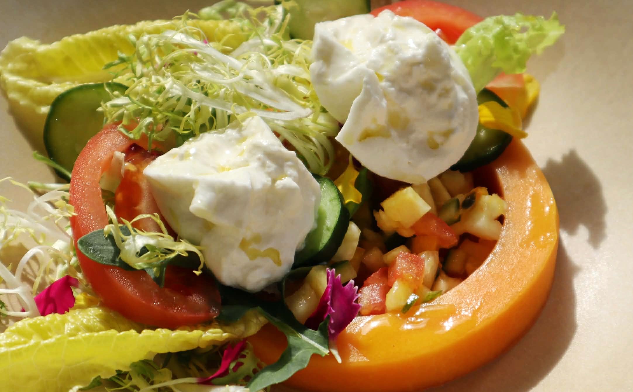 林福有表示,溯源食材是永續美味不可或缺的好幫手。慢慢弄牛奶做成布拉塔起司切開會爆漿的「起司小籠包」新鮮現做,從好乳源的選擇、無添加的生產,傳遞起司多變的風味與應用的精神。風味更濃郁融合了在地水果與水耕沙拉,成了最好的畫龍點睛。