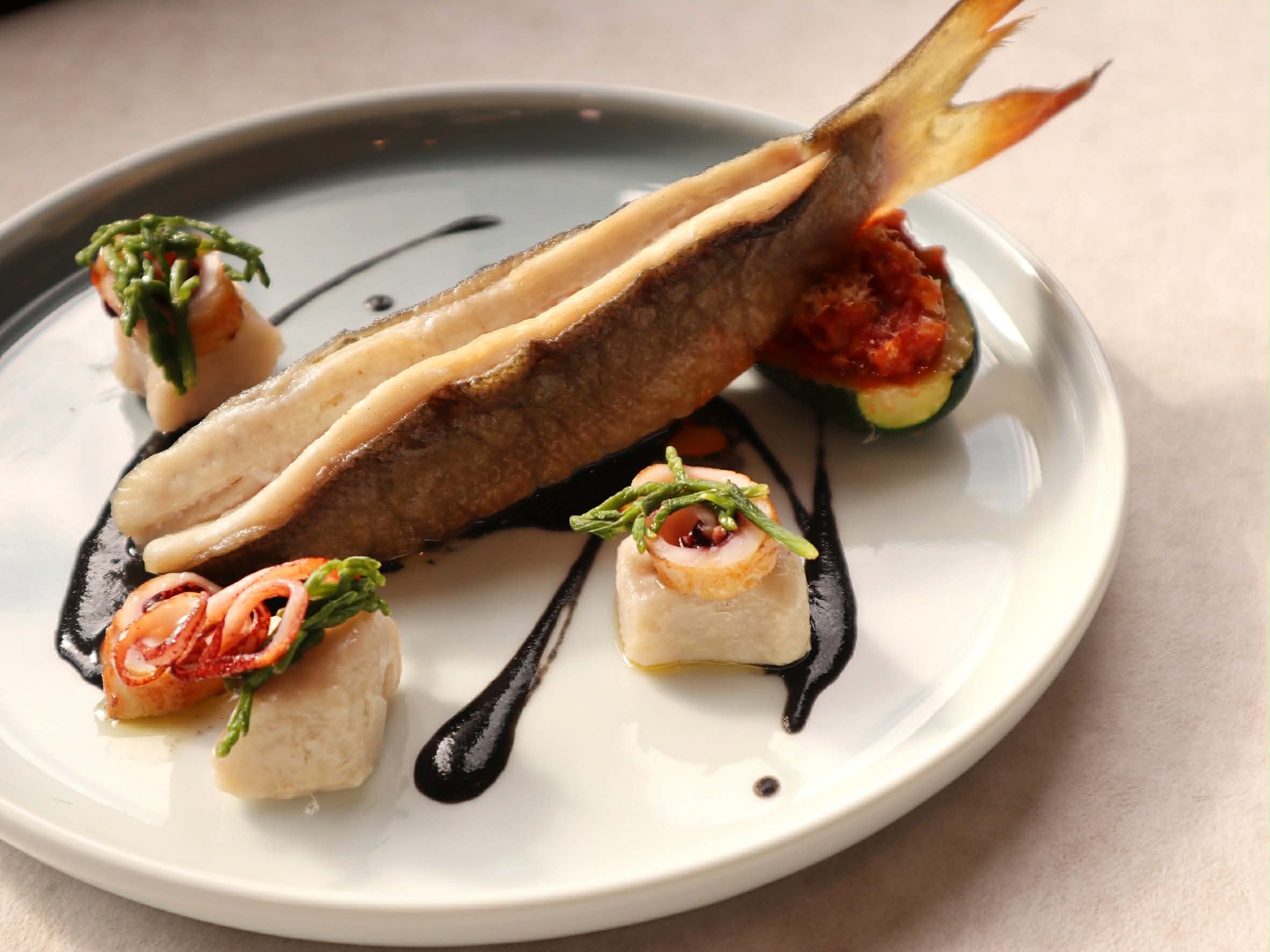 屏東午仔魚以肉質細嫩、油脂豐厚及刺少著稱,主廚以乾煎鎖住鮮甜,使其外酥內嫩的口感。首度嘗試以芋頭麵疙瘩揉入大甲芋頭,將芋香融入奶油麵體,Q 彈富有嚼勁;搭配雲林西螺海蘆筍與透抽,以墨魚醬汁收尾,層層堆疊海味深度。此道料理不僅展現島嶼物產豐饒,更實踐低碳原物料在地漁產支持的理念。