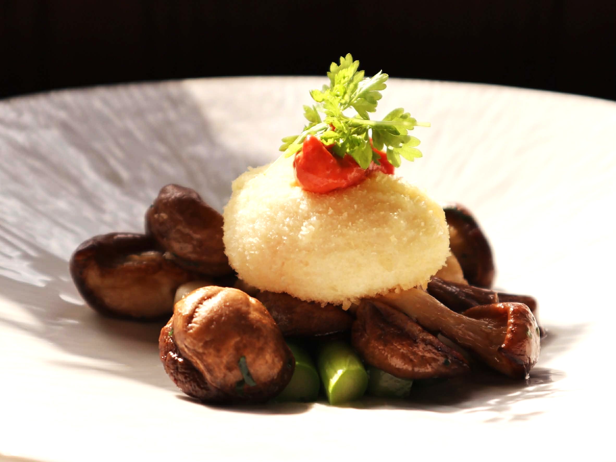 主廚透過食材讓料理回歸純粹,使用新社韓小菇乾煎逼出天然鮮甜;彰化綠蘆筍快炒保留翠綠爽脆;採用嘉義牧場非籠飼雞蛋以 64 度慢煮後酥炸,外酥內軟、蛋黃緩緩流淌。韓小菇特有的露珠香氣、蘆筍的清甜與蛋黃的柔滑軟糯,在盤中層層堆疊,展現山林與平原之間的味覺平衡。