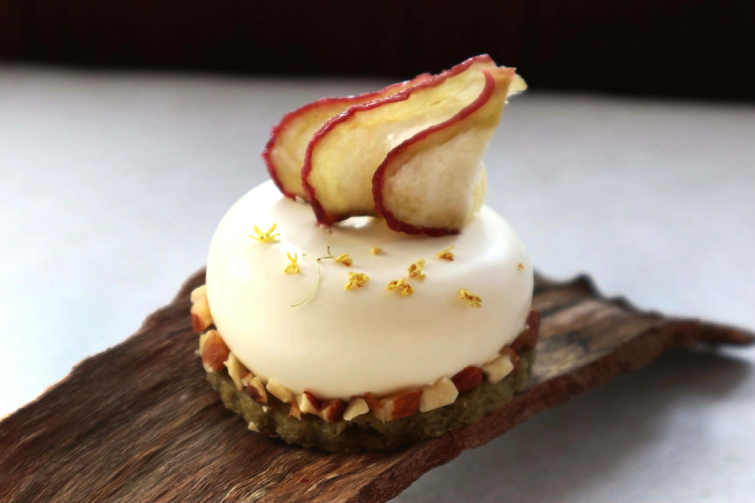 根莖到花釀芬芳,每一道甜點,都是食材與味蕾記憶的交會點。蓮霧桂花慕斯蛋糕使用台灣金萱茶製成蛋糕為底,茶香清雅;慕斯加入新鮮桂花靜置於桂花釀;以蓮霧果凍做為夾心,保留清脆水潤;整體口感細緻輕盈,再以風乾 10 小時的糖漬蓮霧果乾裝飾點綴。桂花幽香、蓮霧清甜與金萱茶韻交織,描繪出台灣亞熱帶氣候的風味縮影。
