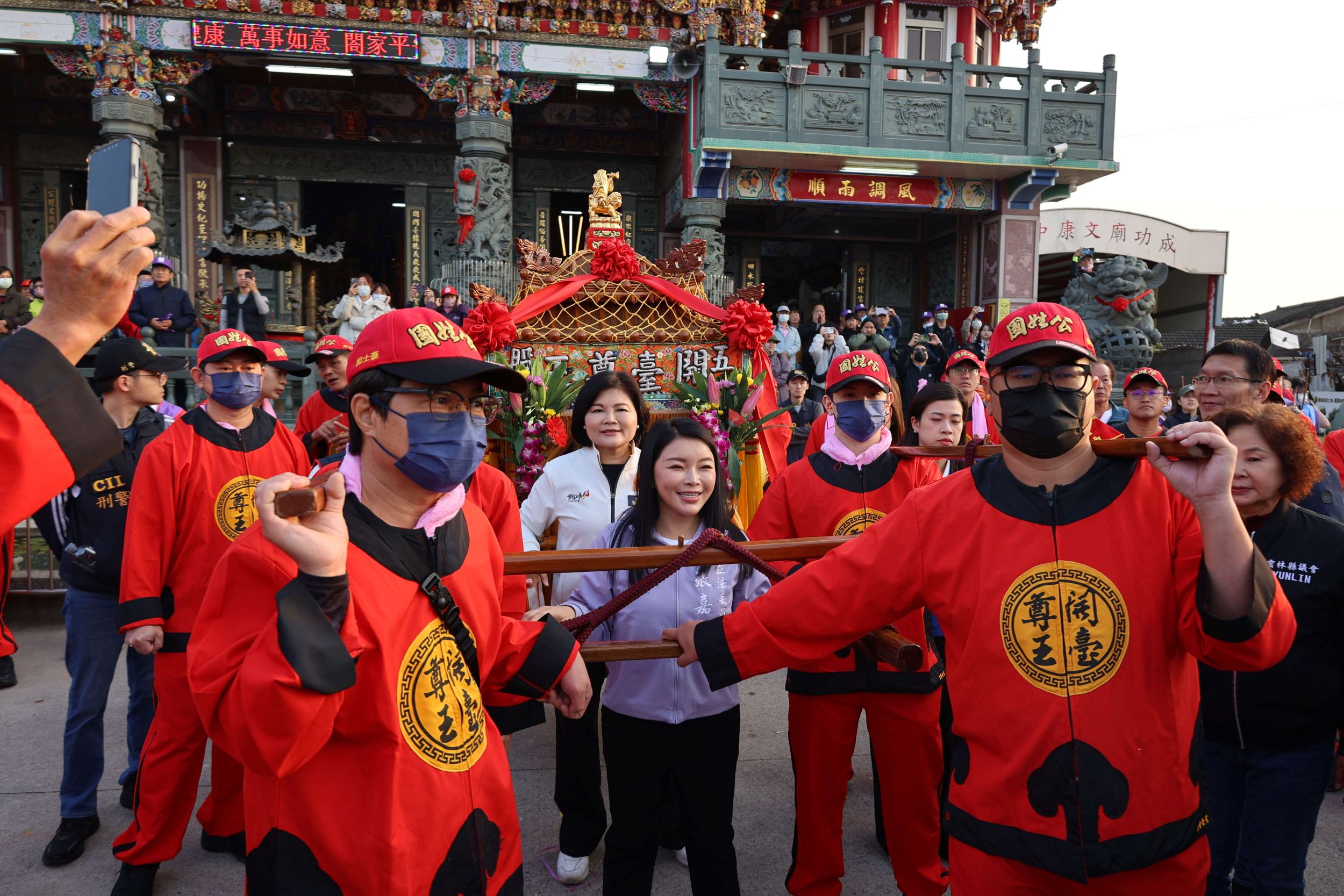 ▲縣長張麗善與立委張嘉郡掌轎,恭送五股開臺尊王國姓公前往斗南鎮靖興里。(圖/雲林縣政府提供)
