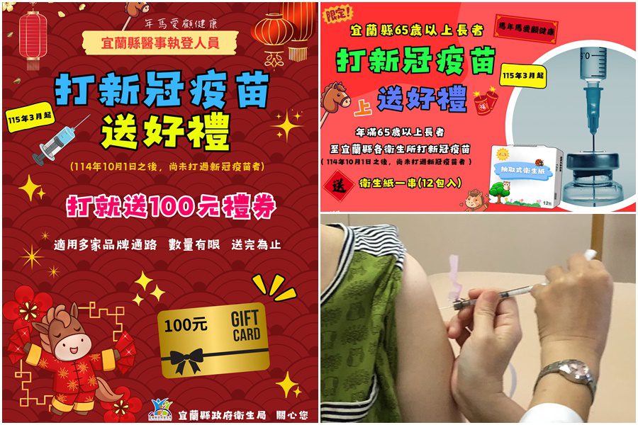 為提升高風險族群防護力,宜蘭縣政府衛生局推出新冠疫苗接種加碼鼓勵措施,即日起,凡於114年10月1日以後尚未接種新冠疫苗的65歲以上長者,到縣內12鄉鎮市衛生所完成接種,即可獲得「衛生紙1串(12入)」1份;醫事執登人員接種新冠疫苗,亦可獲得「100元禮券」1份,數量有限,送完為止。