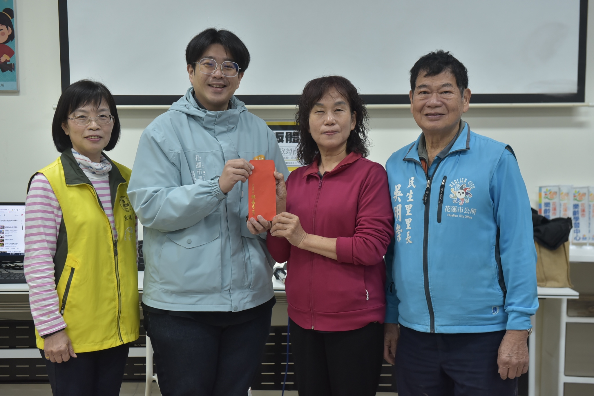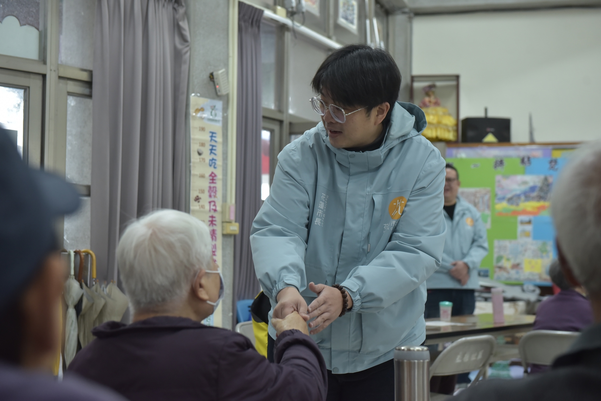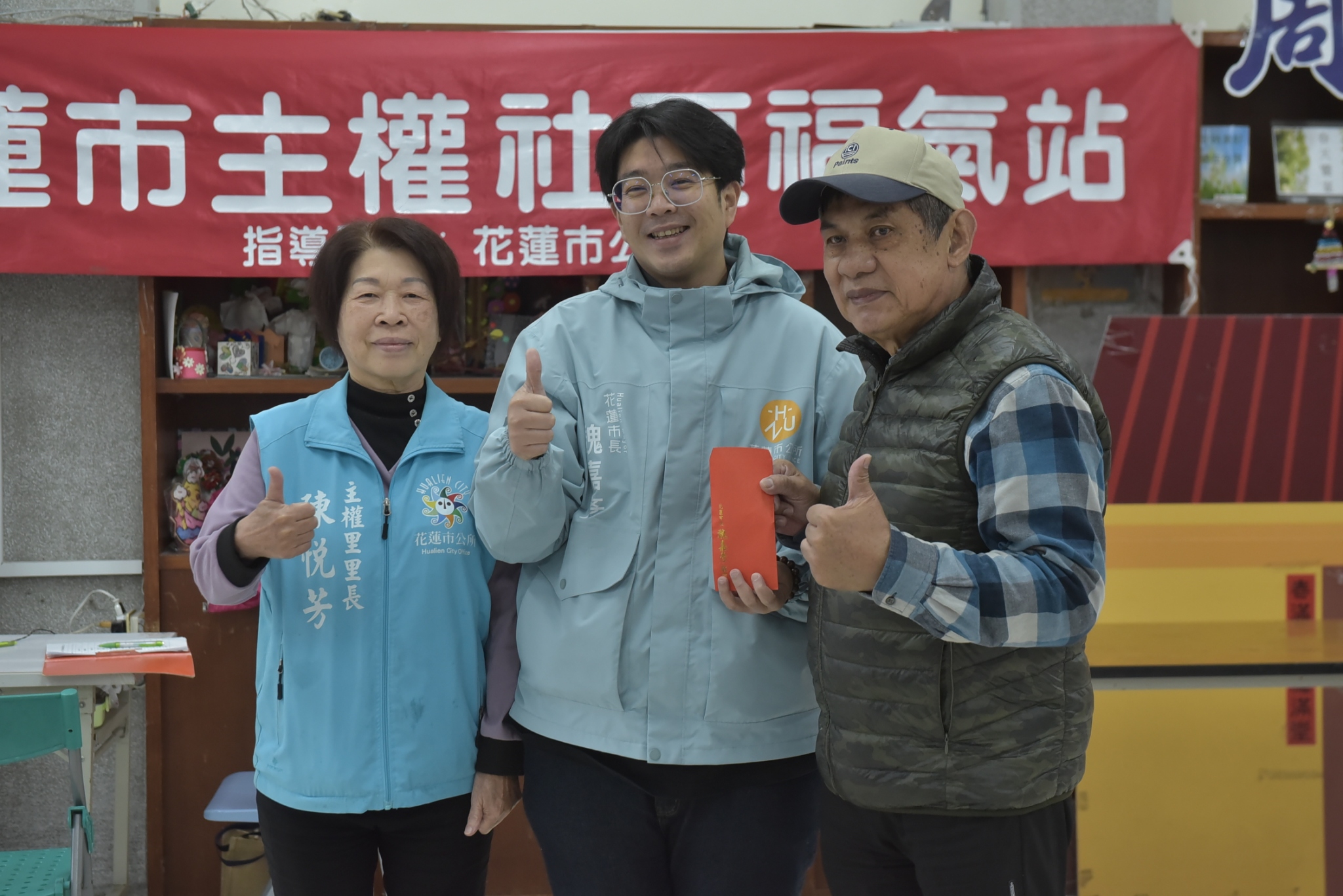 花蓮市有22個福氣站,在農曆年後陸續開站,魏嘉彥偕同社勞課長蕭子蔚今天上午前往花蓮市各福氣站發送春節加菜金,預計在21日全數發送完畢。他親切地和長者話家常,也感謝社區志工與社區發展協會的夥伴們對老人家照顧得無微不至,讓長者都能擁有一個舒適、安全的環境學習新事物。