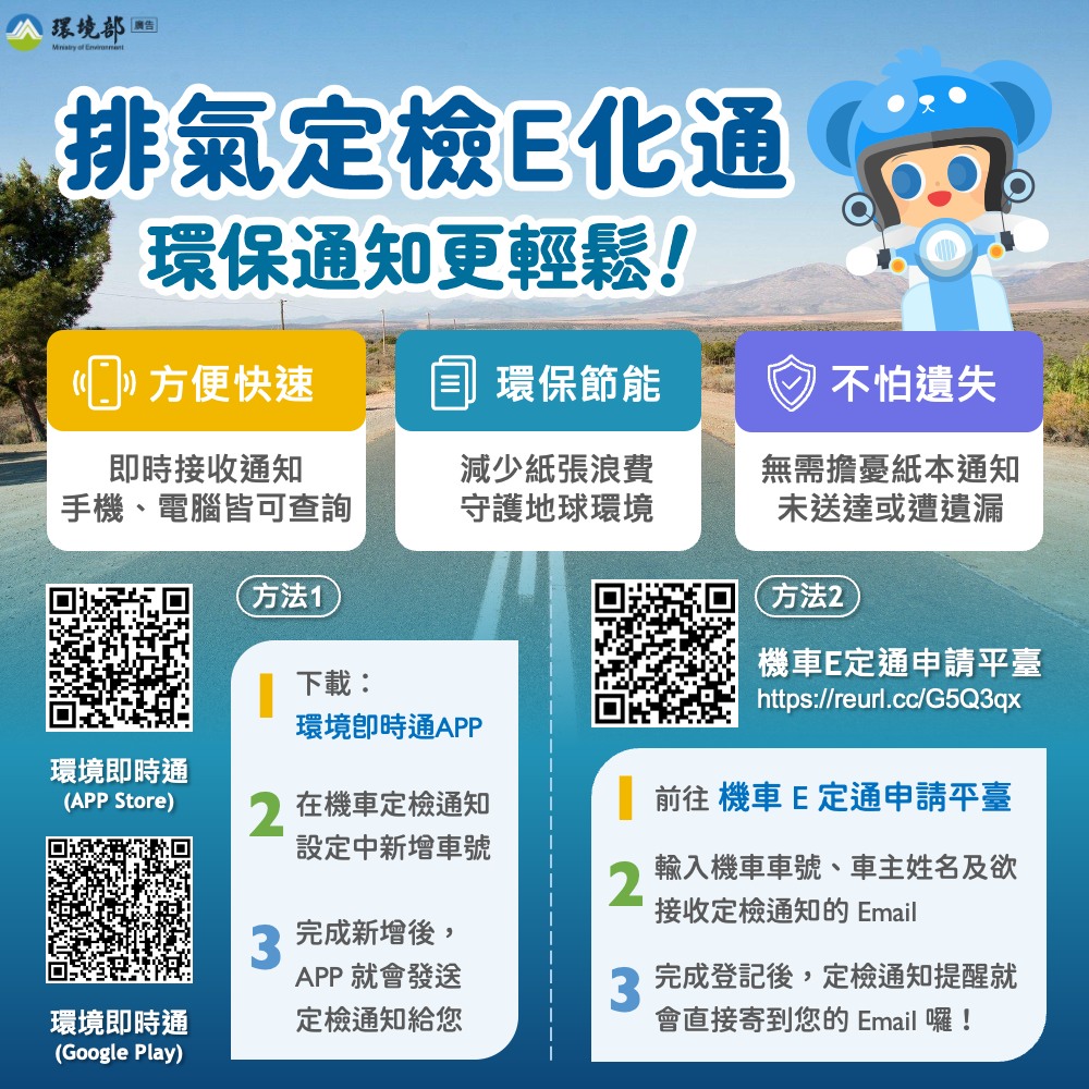 縣環保局指出,目前已整合四項數位通知管道,包括「環境部Email」、「環境部LINE@會員」、「環境即時通APP推播」及「花蓮縣定檢E化簡訊」,車主完成資料登錄後,即可於定檢期限前收到提醒,不再因地址異動或疏忽而錯過通知。