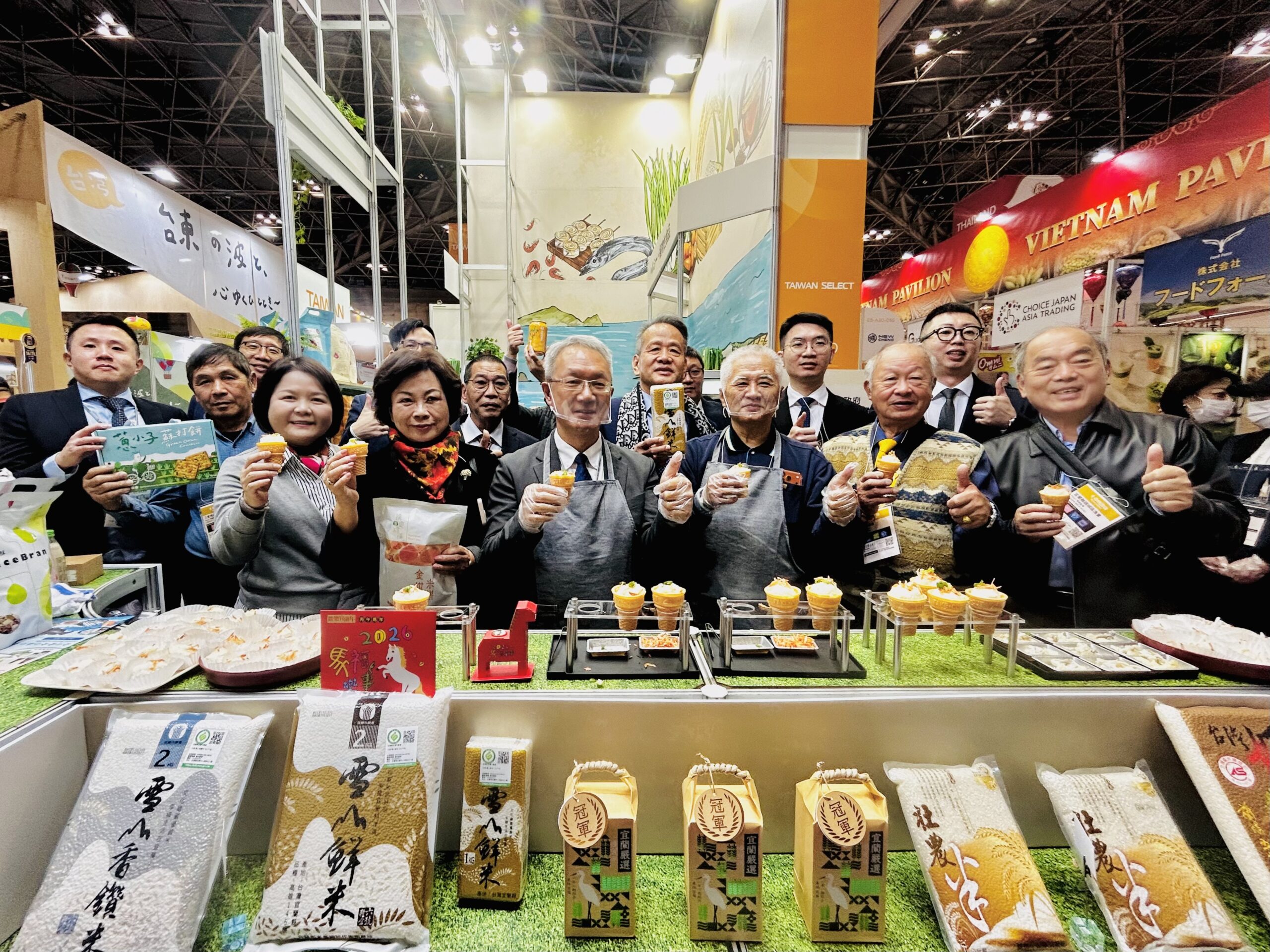 開展首日,「宜蘭嚴選館」吸引大量國際採購業者與日本民眾,現場品嚐豆豆米脆脆、金棗核桃糕、素馨紅茶及嬌澳蝦餅後紛紛讚不絕口,對宜蘭美食留下深刻印象。林代理縣長更化身食農教育講師,現場展示「一期一作、農藥零檢出」的宜蘭嚴選米選品制度,搭配三星蔥與櫻花蝦製作甜筒米飯糰,佐金柑氣泡蜂蜜酒及素馨紅茶,讓參展業者與媒體大為驚豔。