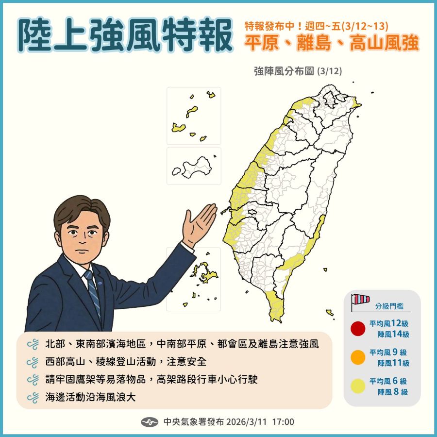 注意!受到東北風偏強影響,從今(11)日下午至12日晚上有強風出現!中央氣象署針對15縣市發布「陸上強風特報」, 從新北、桃園到中南部的雲嘉南高屏,甚至連臺東、澎湖、連江都在警戒範圍內,而且不只海邊及離島,高山與中南部平原也都要注意!