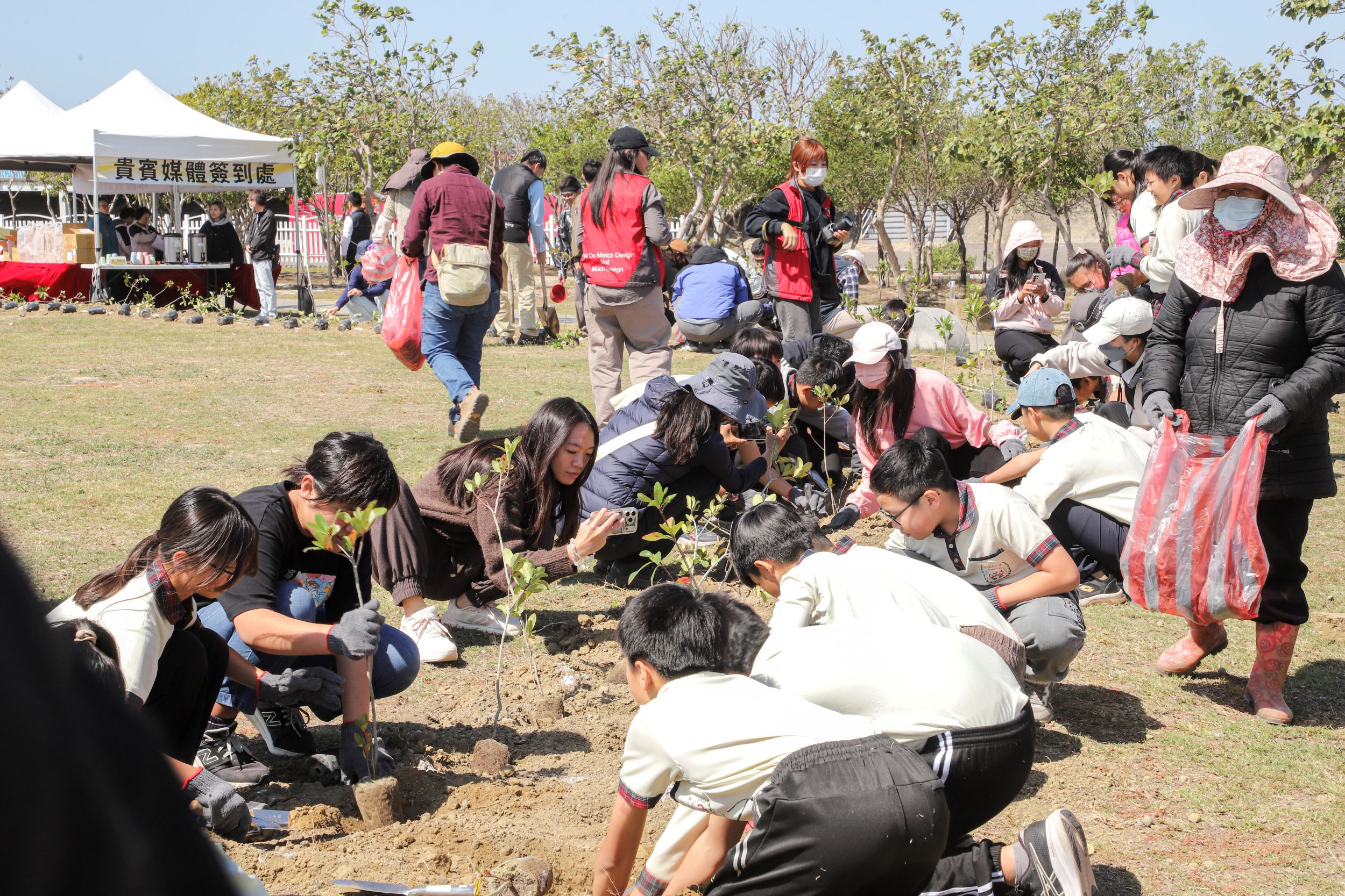 活動現場種植厚葉石斑木、山欖、黃槿及白水木等適合濱海生長的樹種,並由翁章梁、徐振能與兩位布袋國小學生示範植樹流程,從挖穴鬆土、扶正樹苗、回填壓實到澆水定根,一步步完成植栽。最後大家將手寫祈福卡掛在樹苗上,翁章梁寫下「光耀台灣 點亮嘉義」,而布袋國小學生則幽默寫道「祝你可以在這次的颱風辛苦的活下去」,溫馨又逗趣,為活動增添笑聲。