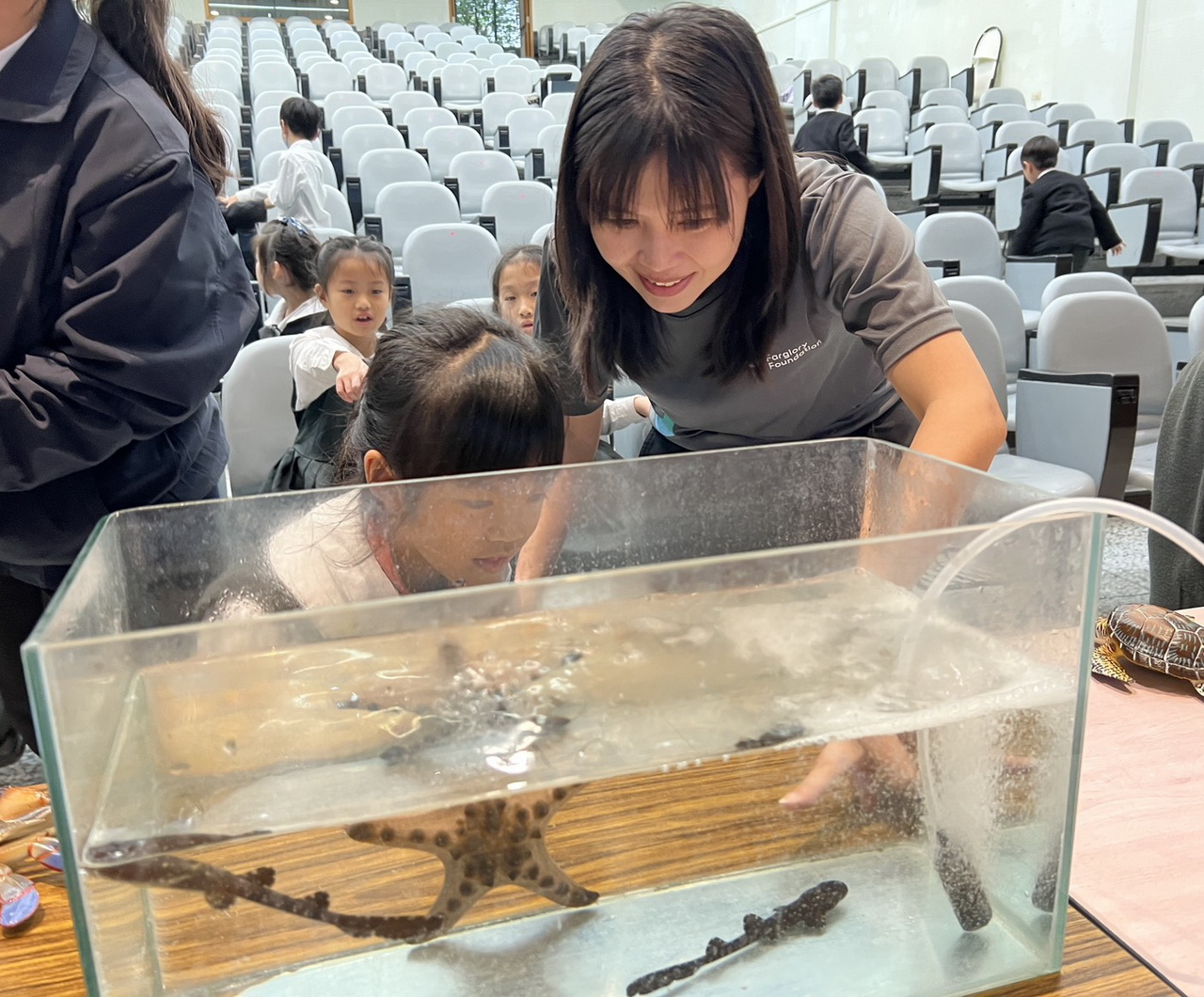 在花蓮舉辦的課程也展現了在地辦理的優勢。由於路程不似前往雙北地區遙遠,活動能帶來更多豐富的教學資源。除了超人氣的紅腿象龜「雪中紅」,更加入了新助教「黃腹彩龜」,保育員此次更特別攜帶狗鯊卵鞘及海星走進校園,讓教室瞬間化身為小型水族館。課堂上,學童們透過透明的狗鯊卵鞘,近距離觀察胚胎與內部卵黃構造,驚嘆卵鞘孕育生命的奇妙過程。為了增加課程的互動與趣味性,課程活動從生物的外型特徵、行動方式、覓食習性與棲地差異出發,帶領學童認識生物如何在環境中生存。並透過掠食者與獵物的角色扮演遊戲,深入體驗與理解生物的適應作用。「玩中學」的教學方式,不僅激發孩子們對自然科學的好奇與興趣,也引導他們思考如何與海洋環境共存共榮,從小培養守護海洋的意識。