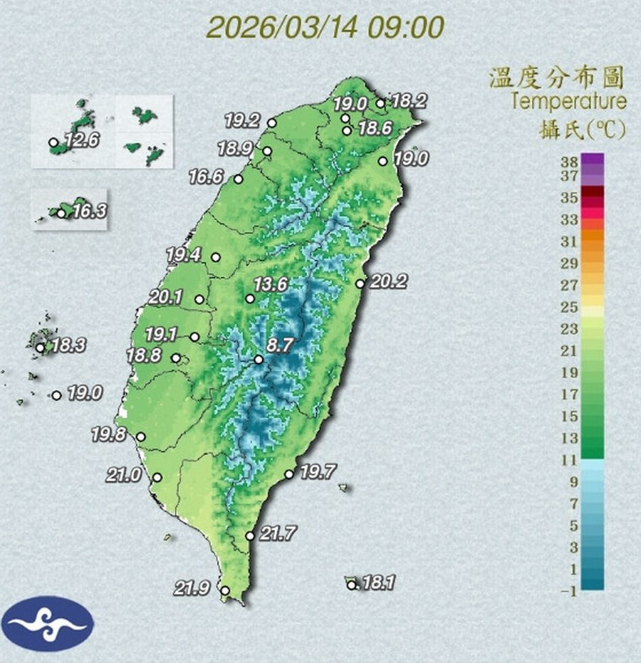 今天3月14日大陸冷氣團逐漸減弱,白天氣溫回升,但因輻射冷卻影響,各地早晚仍然偏冷;臺灣各地及澎湖、金門、馬祖為晴到多雲,日夜溫差大。