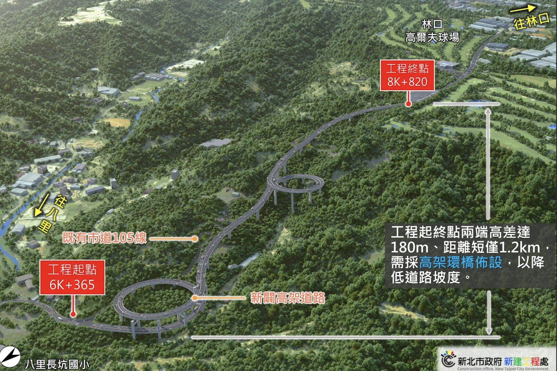 市道105線為新北市林口、八里及淡水間重要聯繫道路,隨著林口國際AI +智慧園區及台北港特定專區持續發展,交通運輸需求大幅增加,新北市政府繼與中央攜手推動新闢林口A3道路成功後,亦持續推動市道105線全線改善計畫,目前第1期A3道路工程預計115年完工,第2期蜿蜒路段於今日決標,以及第3期八里平面路段辦理細部設計及都市計畫變更作業中。