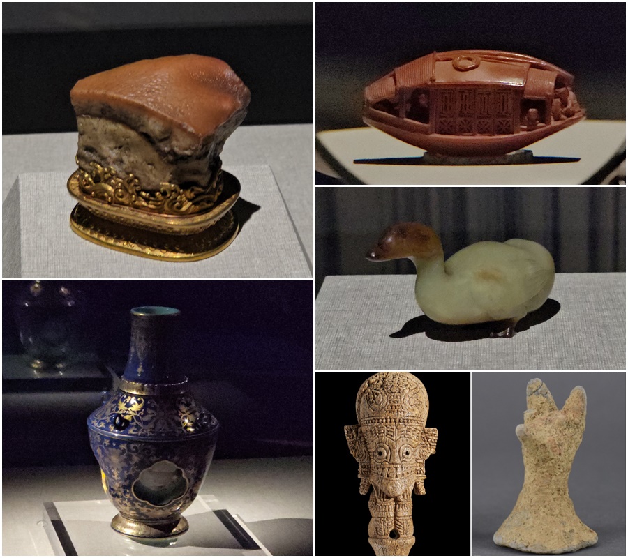 這次故宮國寶首次「東渡蘭陽」,院方特別精選15件國寶珍藏,包括高人氣的肉形石、游魚轉心瓶、玉鴨、雕橄欖核舟等珍寶,以及宜蘭縣堪稱「國寶級」的史前出土文物人獸形玉玦、骨質人形刀柄、「金鯉魚」魚形金屬編織等15件珍貴遺物並置展出至3月22日止。