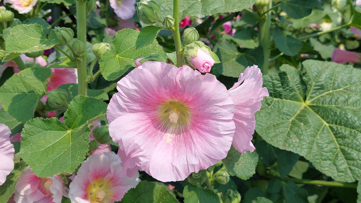 ▲蜀葵花因花序可持續向上生長、開花,最高可達約2公尺以上,因此又稱「一丈紅」或「花中巨人」。(圖/記者蕭麗鳳攝)