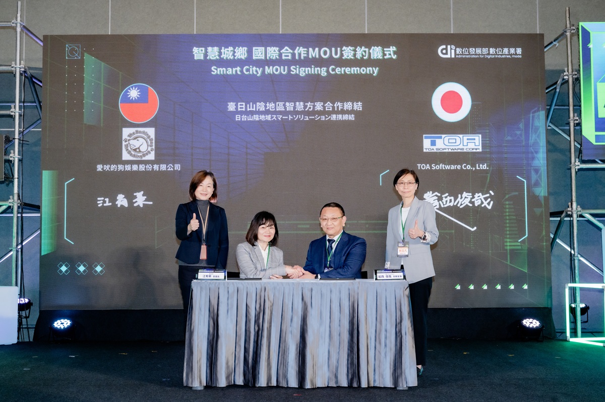 數位發展部數位產業署3月19日於南港展覽館二館舉辦「2026智慧城鄉創新匯流沙龍暨創業歸故里授證典禮」,匯聚智慧城鄉服務業者及40家「創業歸故里」的獲獎團隊,共同分享智慧科技於地方場域的應用成果。現場更傳來兩項跨國合作捷報,首先,在數產署黃雅萍副署長及比利時駐台代表馬徹(Matthieu Baudouin A. Branders)的見證下,臺灣數位照護業者「先進醫資」與比利時商「Dermatoo」正式簽署合作協議;另在數產署黃雅萍副署長及資策會林玉凡副執行長的見證下,臺灣數位互動科技業者「愛吠的狗娛樂股份有限公司」亦與日商「TOA Software Co., Ltd.(東亞ソフトウェア株式會社)」完成合作簽署,充分展現臺灣智慧城鄉解決方案輸出國際的競爭力。